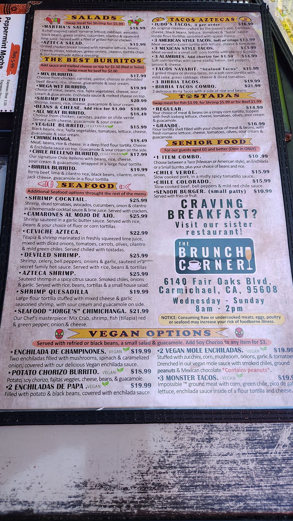 It was my first time eating at this restaurant. The vegan menu is a good size with a nice variety of dishes. Portions are massive in my opinion(So if you like big plates, definitely check this place out). I had the vegan enchiladas with potato,vegan cheese and guacamole and it was well balanced and flavorful. If you are in the Carmichael area and looking for a good Mexican restaurant with vegan choices, definitely would recommend giving this place a visit.