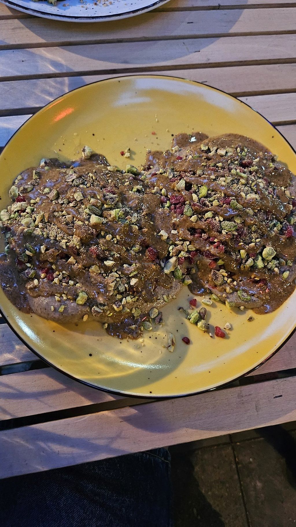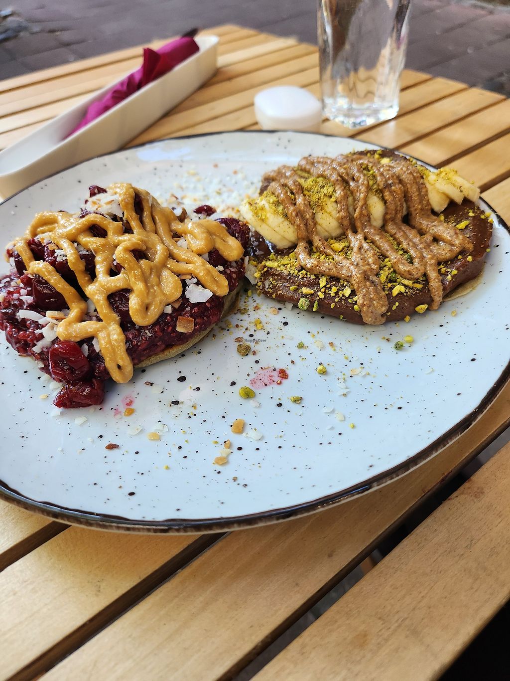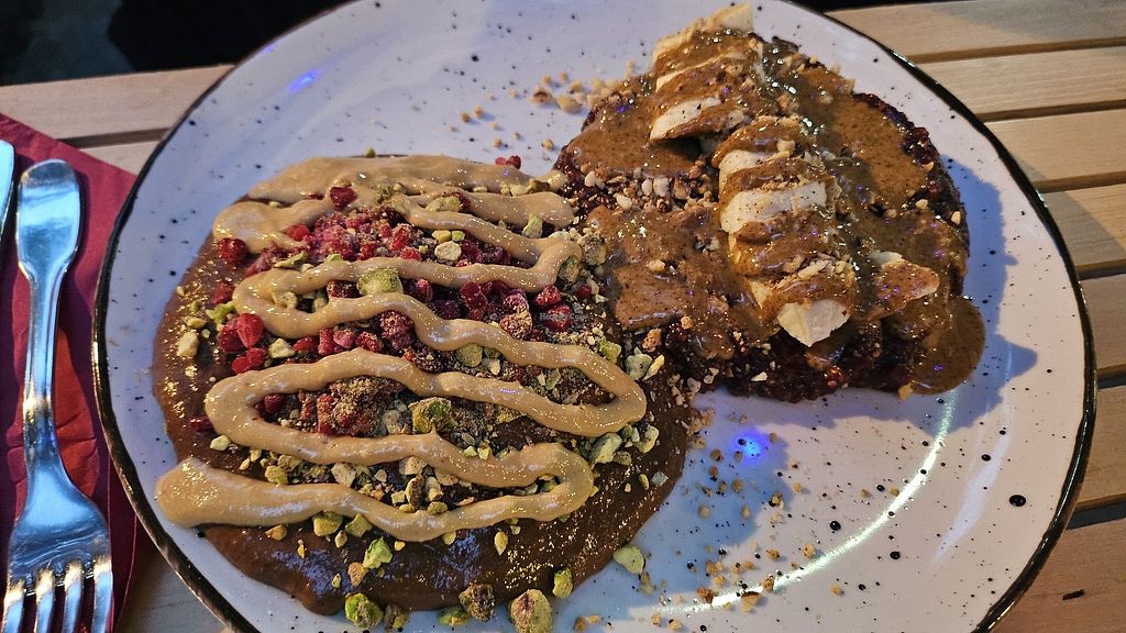 Like people before me has wrote, the pancake portion is big enough for two people. You get to choose which toppings to have on both, and choices consist of a base of blueberry- or raspberry jam or homemade Nutella, plus toppings like fresh berries, banana, pistachio crumbles, almond butter, peanut butter etc etc. Very nice staff as well! Amazing place, def coming back here!