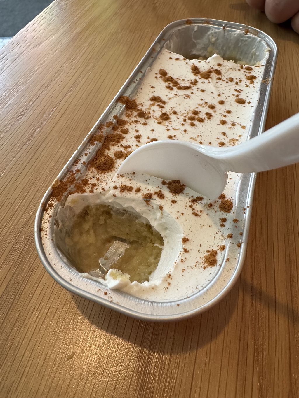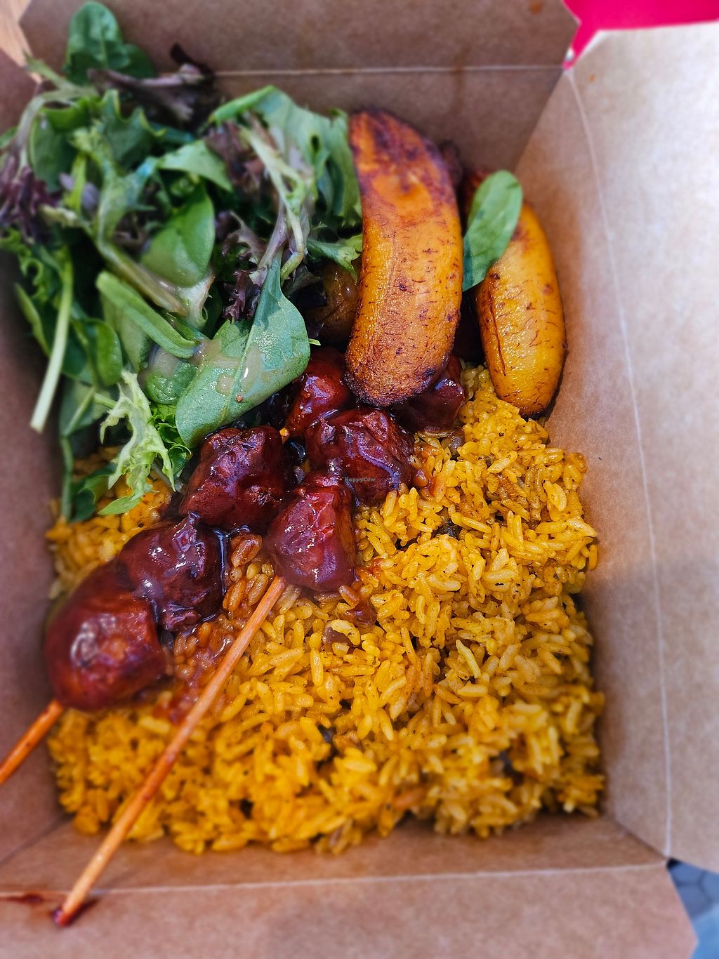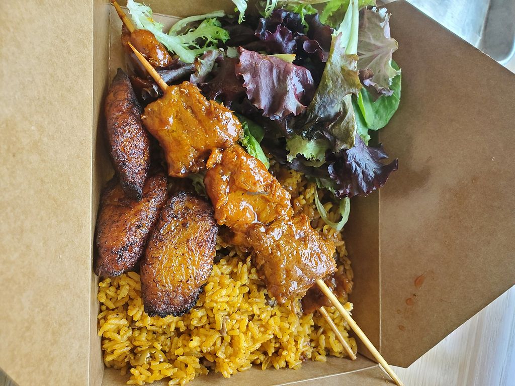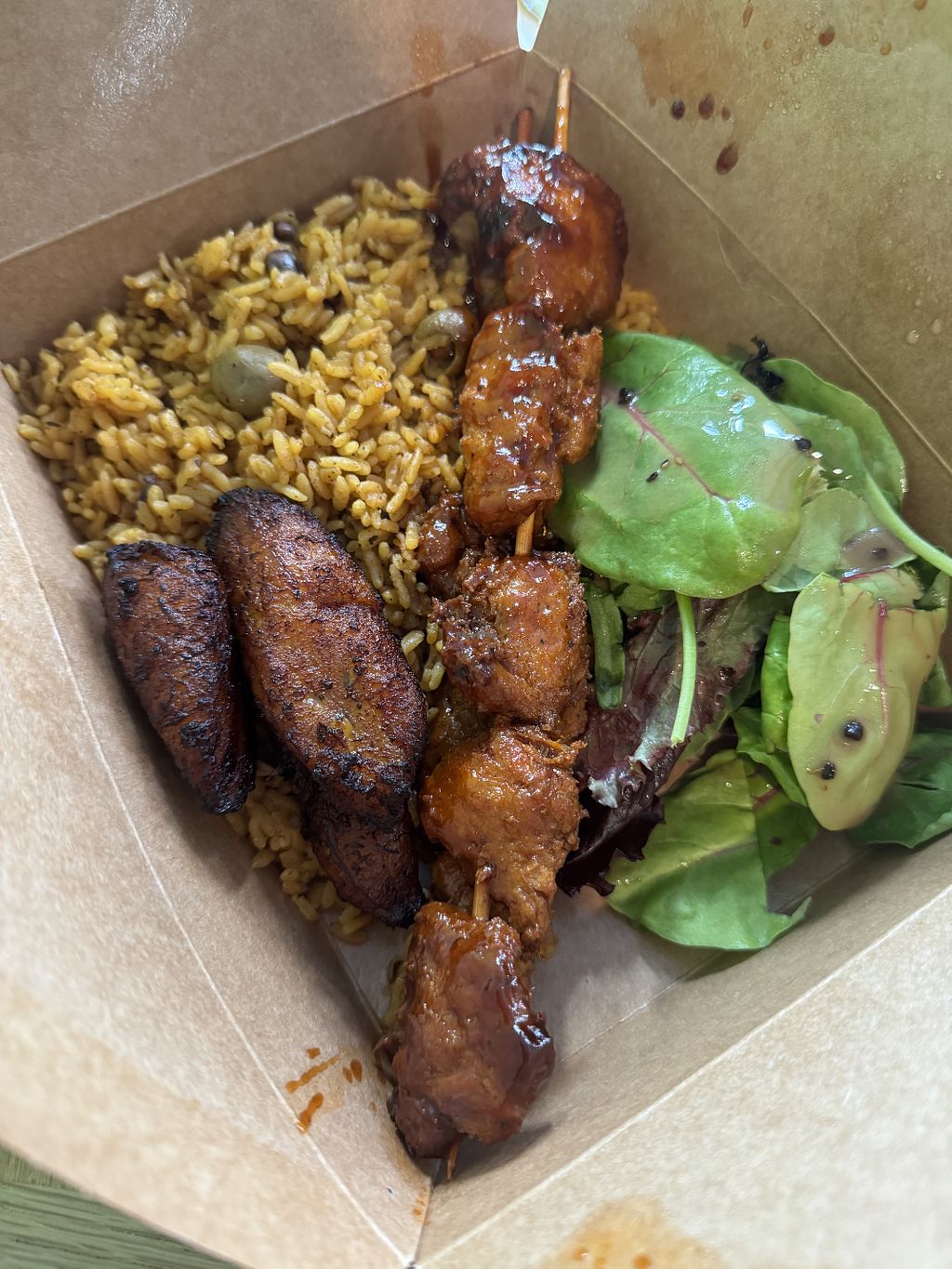 I stopped by for lunch and ordered the pincho sampler plate, which includes rice, two chicken skewers, maduros, and a small side salad. Everything was delicious, but especially the chicken. The texture and flavor were incredible. I also tried the chocolate version of their coquito tres leches cake, which was phenomenal. The cake was so light and fluffy with a delicate cream on top. I am excited to try everything on the menu!