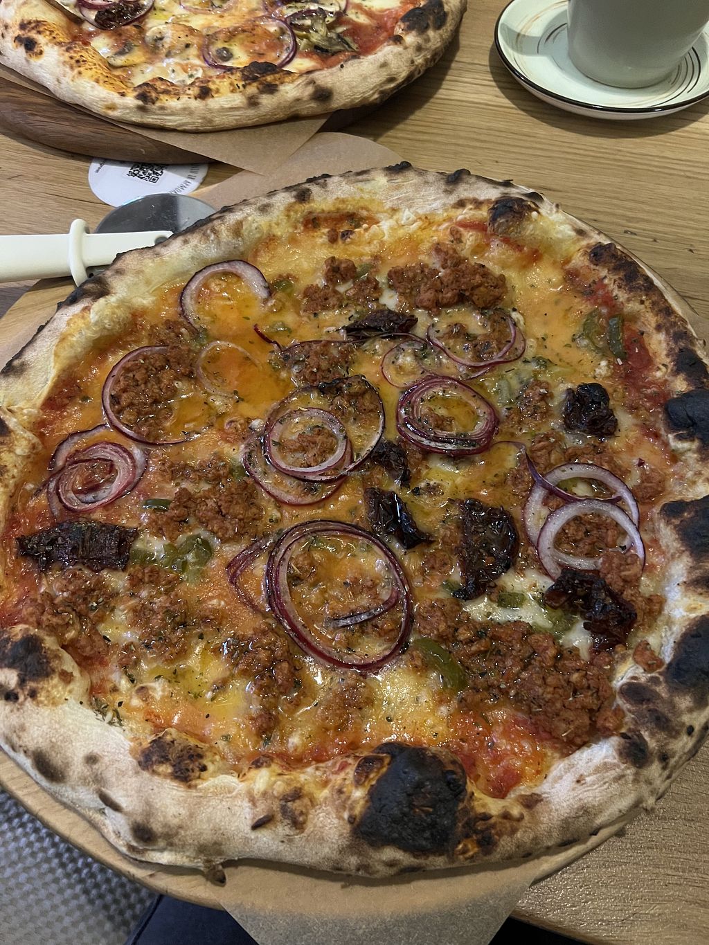 Read moreLas pizzas están hechas en horno de piedra, y algunas están disponibles con queso vegano. Tienen también otros platos veganos.