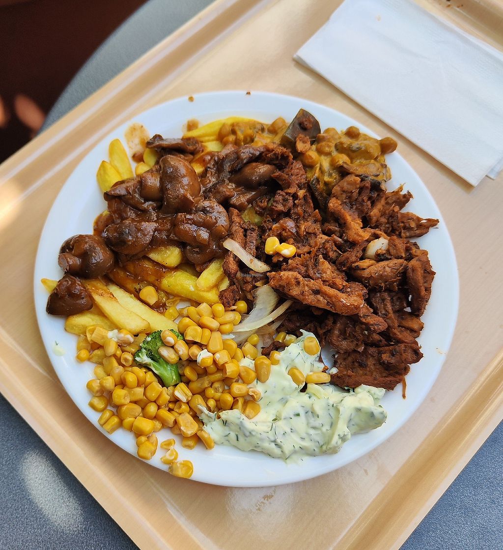 Es gab Kartoffel-Pilz-Auflauf, Pilz-Gulasch und viele verschiedene frische Salate. Es war alles sehr lecker und frisch. Nur zu empfehlen!!
