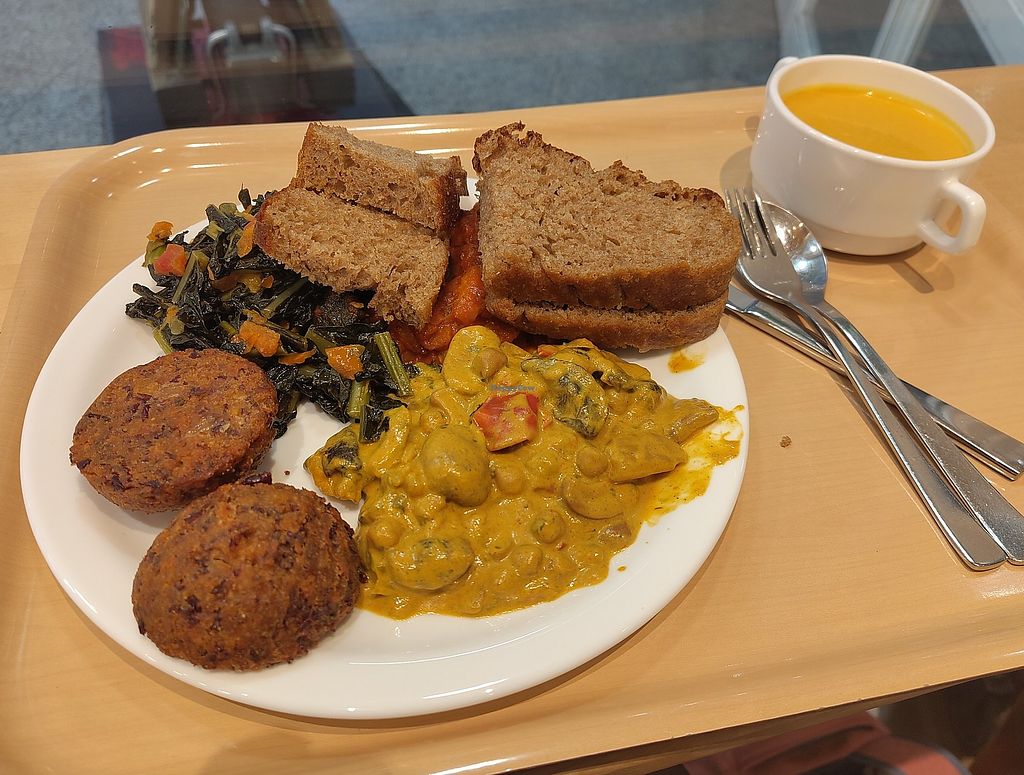 Sowohl zum Frühstück als auch zum Mittagessen (riesige Salatbar und ein warmes Buffet) gibt es hier eine große vegane Auswahl! Alles ist klar deklariert. Das Essen schmeckt sehr gut, ist frisch und die Preise sind fair. Hat ein bisschen was von einer Mensa/Kantine.