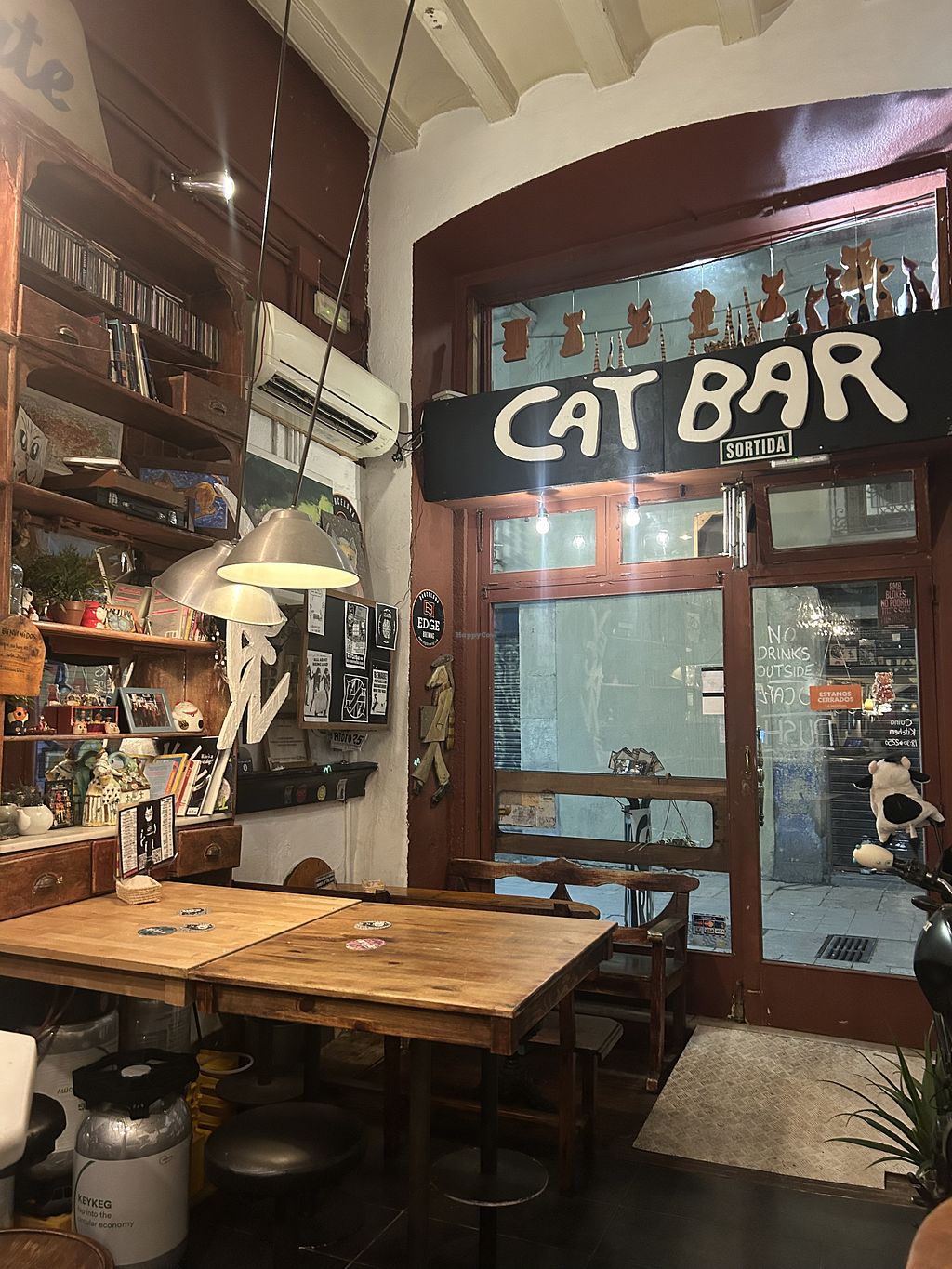 Cat-themed vegan craft beer and burger bar with 9 taps of local Catalan beers. Serves vegan burgers, cactus sandwich, Tof-ish sandwich, double deep fried potatoes, and gluten-free plates. Order at the bar. A piano is available for anyone who can play. Reservations available, not necessary for under 3 people. Max table size 8 people, group booking for up to 18 a day in advance. Heating & Air-con. Companion animals welcome (despite the name no cats live at the venue). Relocated from C/ Boria 17. Open Mon-Sat 18:00-23:30, Sun 18:00-23:00. Last order 1 hour before close. last order for drinks 11pm.