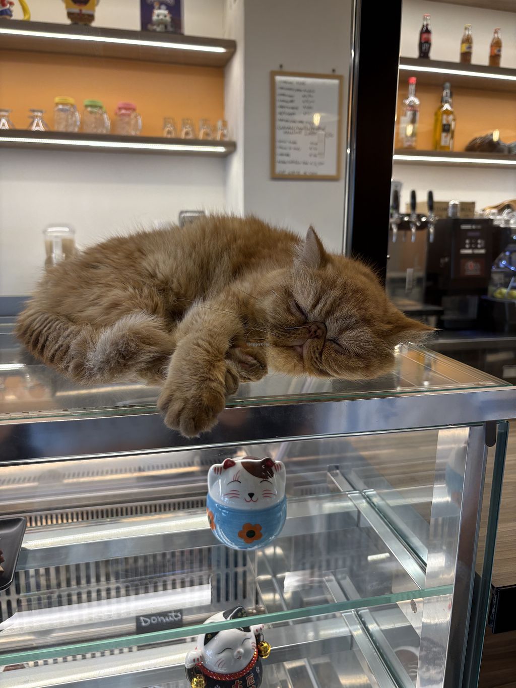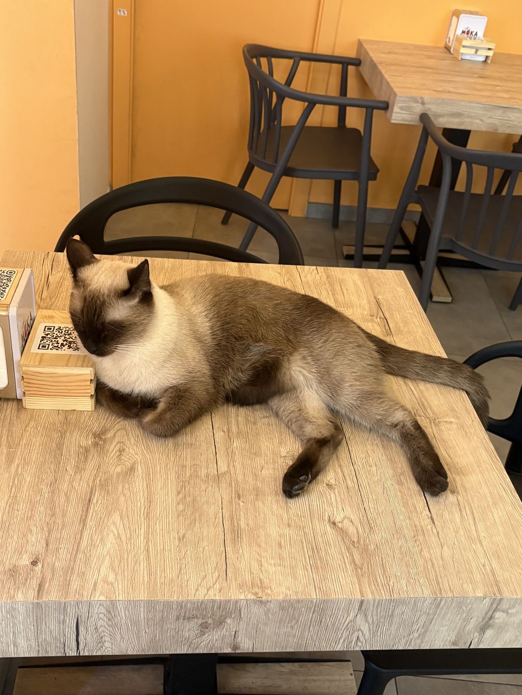 Had a great croissant with hazelnut spread and a caffè latte with soy milk. They have WiFi so working on my phone while cuddling cats was just purrrfect 🥰