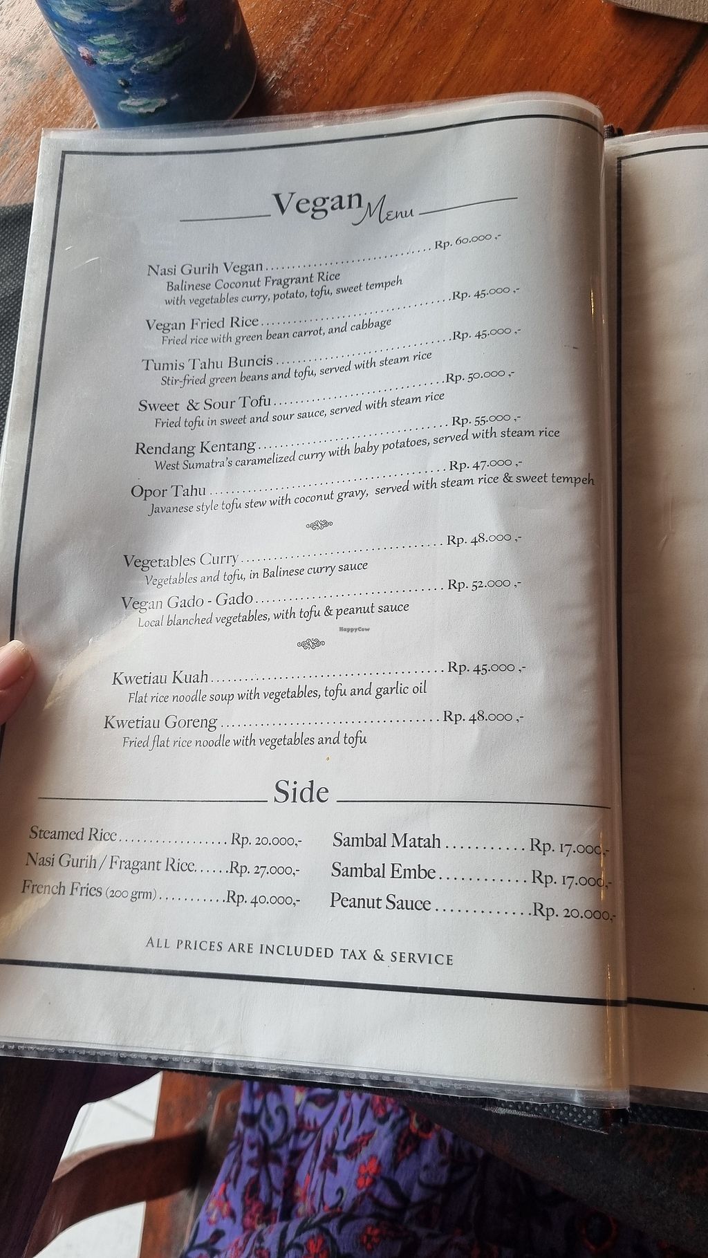 Good vegetarian and vegan options, great atmosphere and friendly staff! The food was nice and the price was so reasonable. Our cheapest meal in Seminyak! We made the mistake of passing this place due to the location as we assumed it would be pricey.