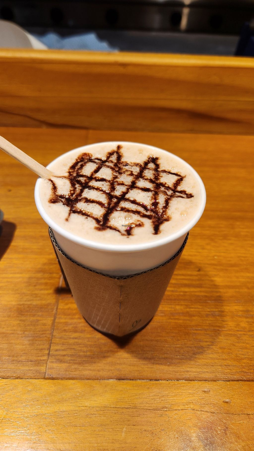 I often got a chai latte/hot chocolate here when in china Town. Customizable to soy milk. You can sit on the second floor above the ethnic shop.