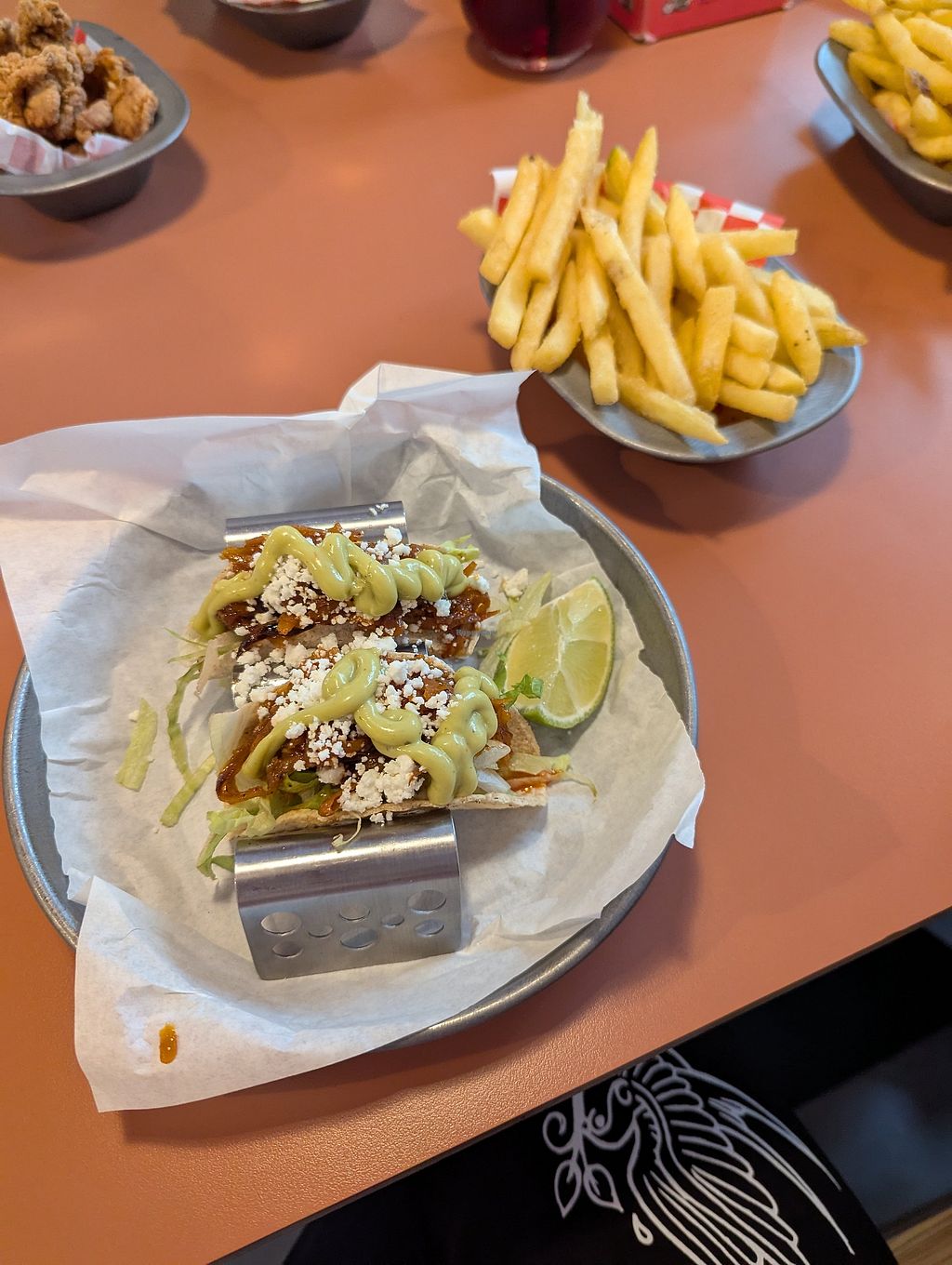 We had tacos, cauliflower wings, loaded fries and fried pickles.