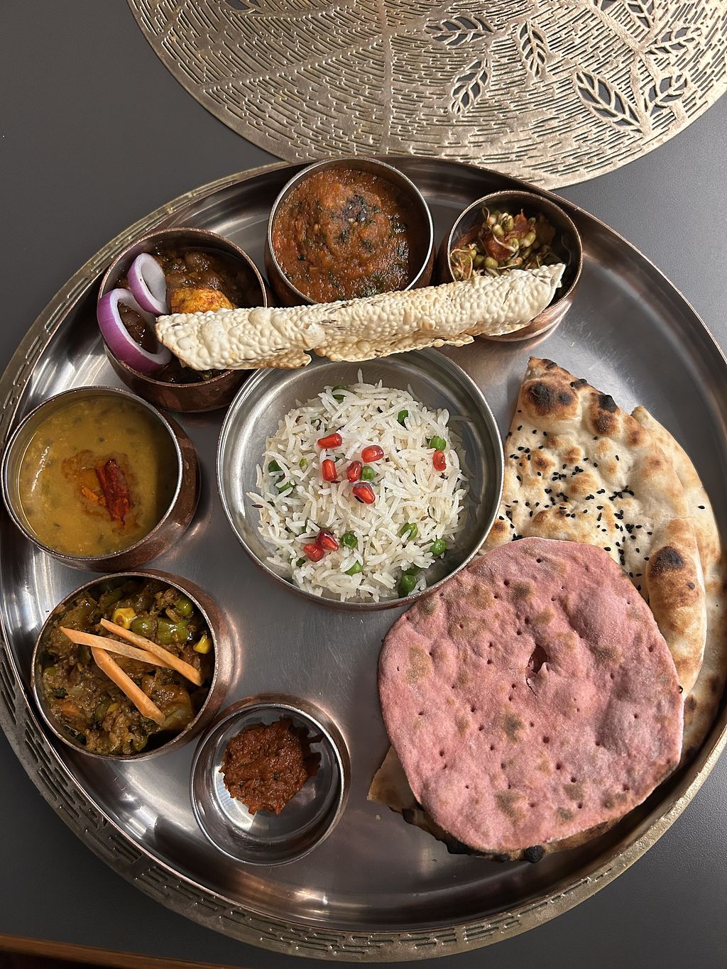 Everything, service (impressively fast and pleasant) quality quantity of food, taste - nothing lacking . Everything made from scratch, price is worth it. Thali had rice pulao, nan, tandoori roti, vegetables chat, papad, dahi vada, dal, paneer Sabzi baigan Bharta, tomato chutney, aloo gobhi was so good.
