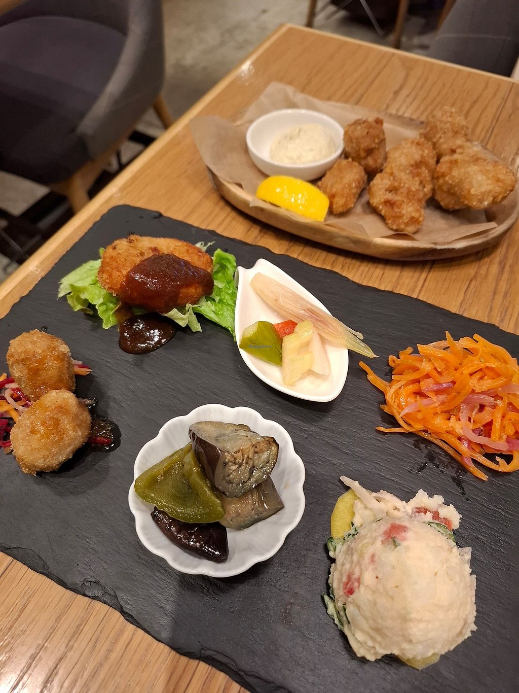 We had a very nice dinner at the restaurant. Both had a plate with an assortment of dishes. And had vegan donuts as dessert. All very tasty!