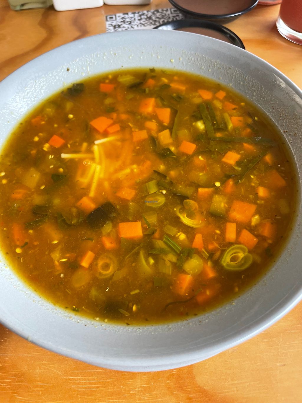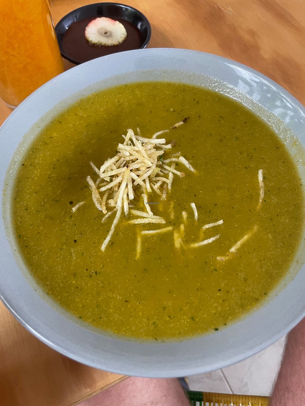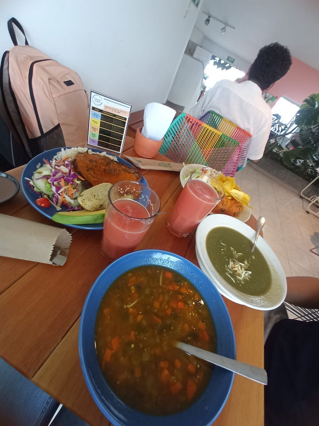 Read moreWe had the menu del dia (they also have an extensive normal menu), which comprised juice, soup, a main and little dessert. We had mock fish soup (made with nori) and some kind of root vegetable soup (we’ve had this type/flavour many times in Colombia). The main was rice, seitan, a small arepa, salad and avocado. The dessert was a little apple pie square. Everything was delicious and felt a balanced and filling meal. The fish soup was very unusual and fishy tasting (which we enjoyed). Only complaint would be some dressing on the salad.
