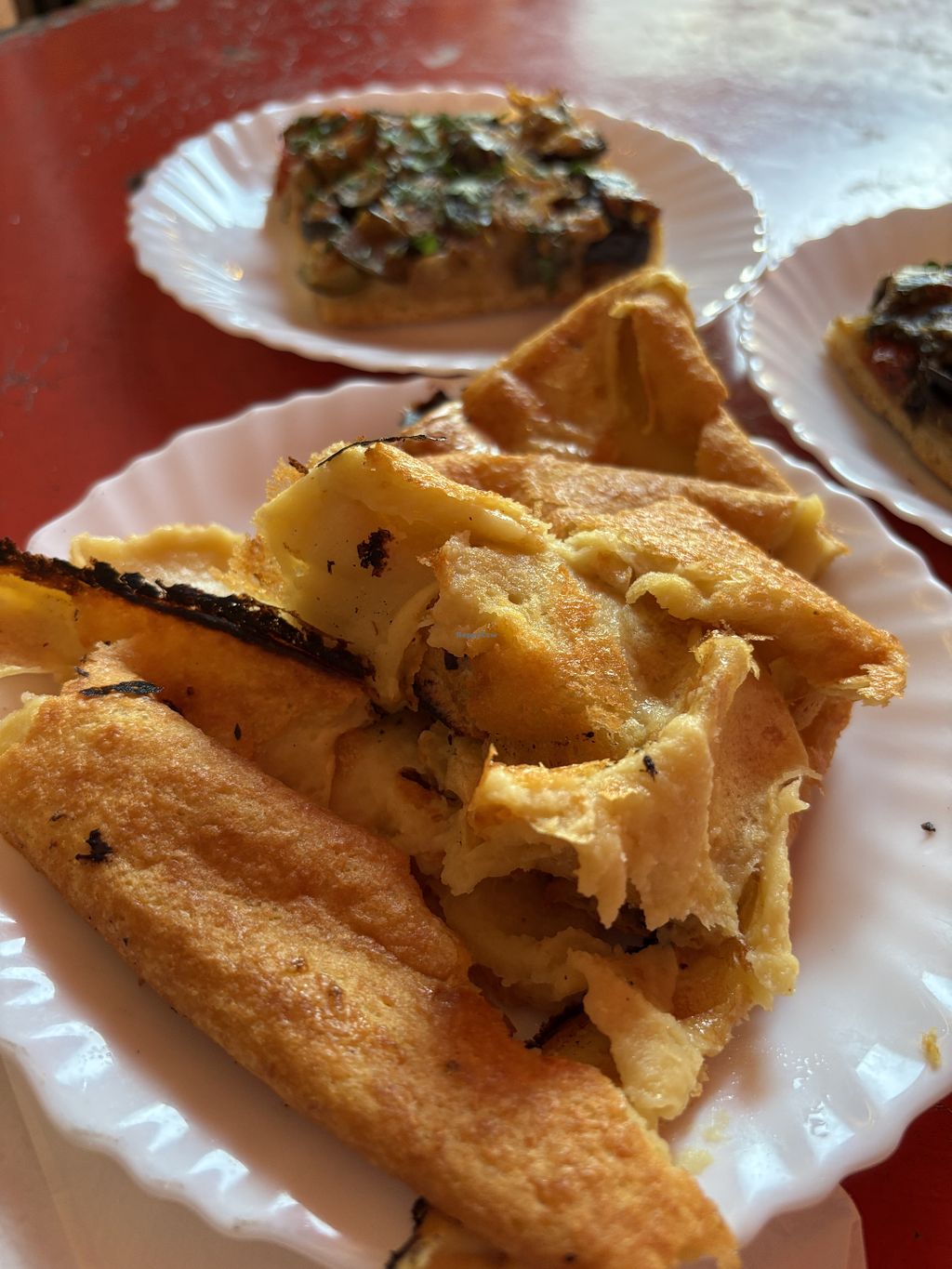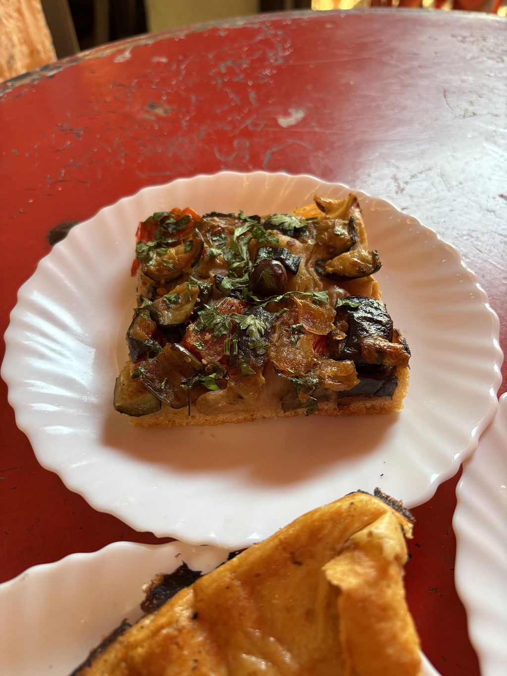 The fresh socca was delicious and worth the waiting in line for! We also tried two flatbreads with vegan toppings - one had ratatouille on it and the other one was mushroom and eggplant. Those tasted like they had been sitting out all day, but we did go right before closing. Note that you need to buy a drink to use the seating area, but their drinks are also very cheap.