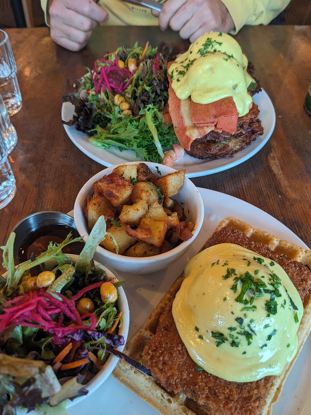 A quirky and cosy restaurant with super friendly service. We had the french toast, blueberry oat pancakes and the schnitzel waffle benechick with a vegan poached egg. This was genuinely one of the best brunches we’ve had! The french toast was itself delicious and crispy and came with even more delicious caramelised banana and fresh strawberries! The blueberry pancakes were a perfect texture and tasty (especially with the blueberries and banana inside), and the accompanying whipped coconut cream was a lovely light addition. The schnitzel benechick was very special, with each element delicious by itself but even more so together - the tofu schnitzel was beautifully crunchy and had a brilliant texture inside, the waffle was thick and it was my first vegan poached egg!