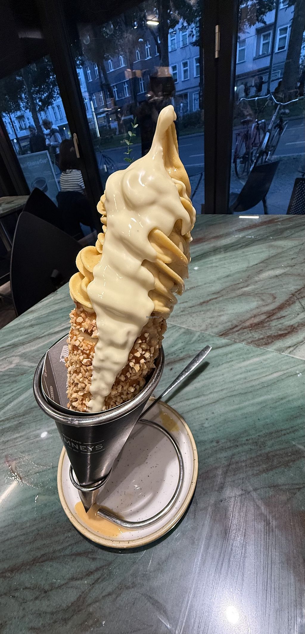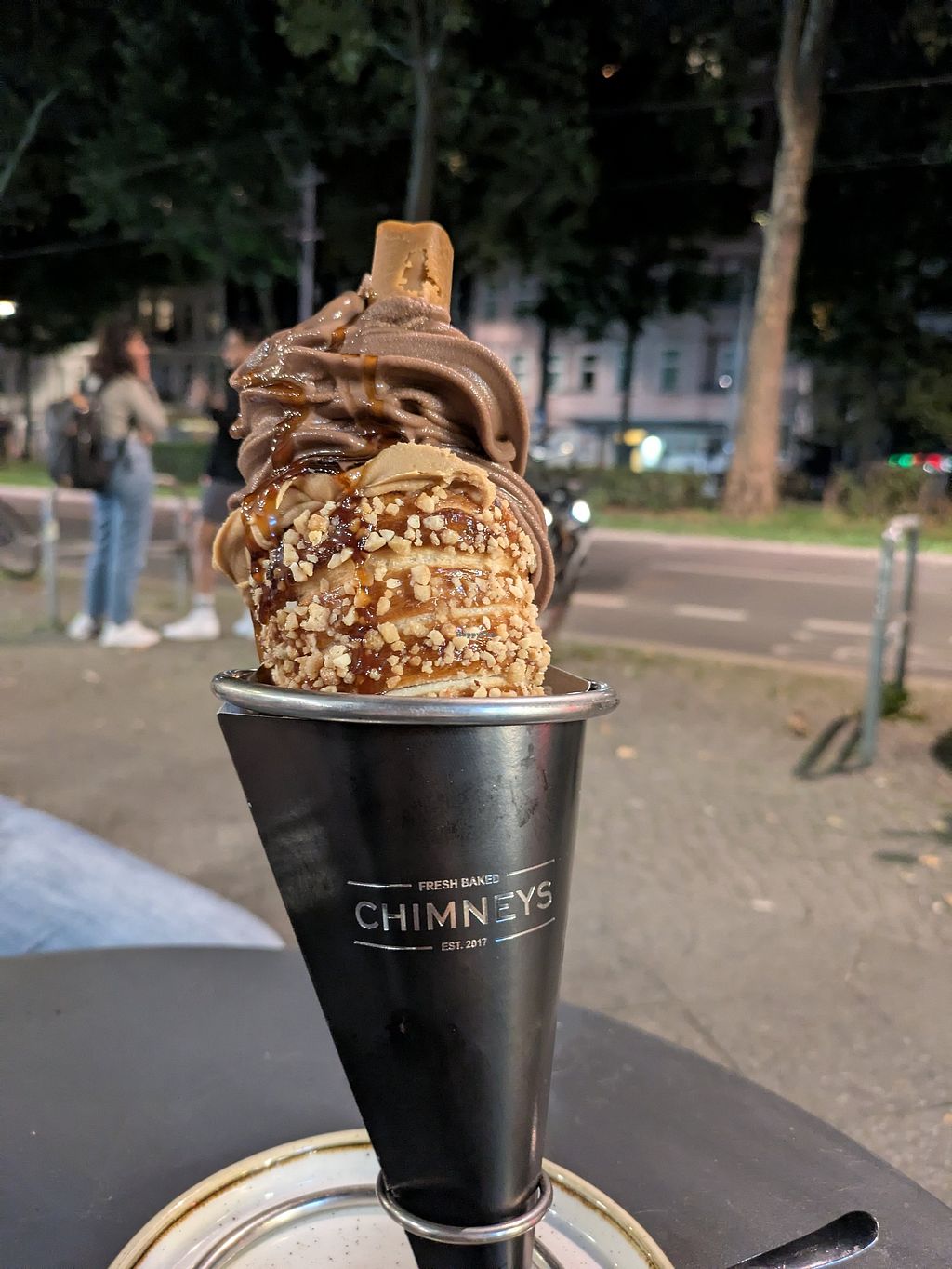 Wir waren sehr begeistert von der Auswahl an Saucen, Toppings etc, weil alles hier vegan ist. Hatten uns dann auch gleich einen chimney cake mit allem gegönnt, also Sauce, 2x cream, Früchten, Eis, Topping etc. Echt eine krasse Geschmacksexplosion, sehr lecker (ich hatte einen Pistazien cake, mit Schokoeis, cheesecake und weißer Schokoladen Creme Himbeeren und manner Waffeln) aber für mich viel zu viel. 😂 wenn ich wiederkomme teile ich mir auf jeden Fall einen Cake.