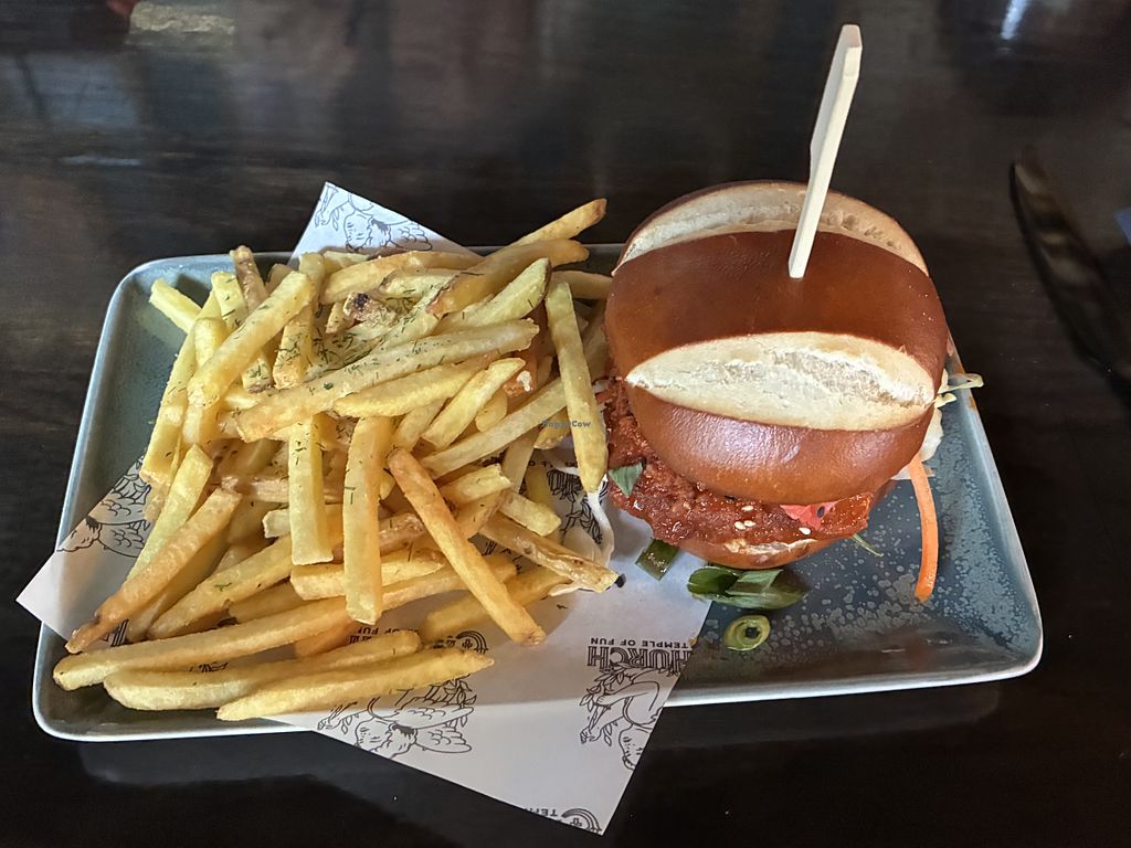 Church is a local spot for us that we’ve visited many times over the years. However, when I noticed they’d put their ‘pickle rib’ sandwich onto their permanent menu (a veganised McRib) I knew we had to come back. We were not disappointed. The order comes with fries and you can ask for sauces free of charge - we opted for the syko sauce and chipotle mayo which were both delicious. Great service, atmosphere, drinks and food. Church nails it every time.