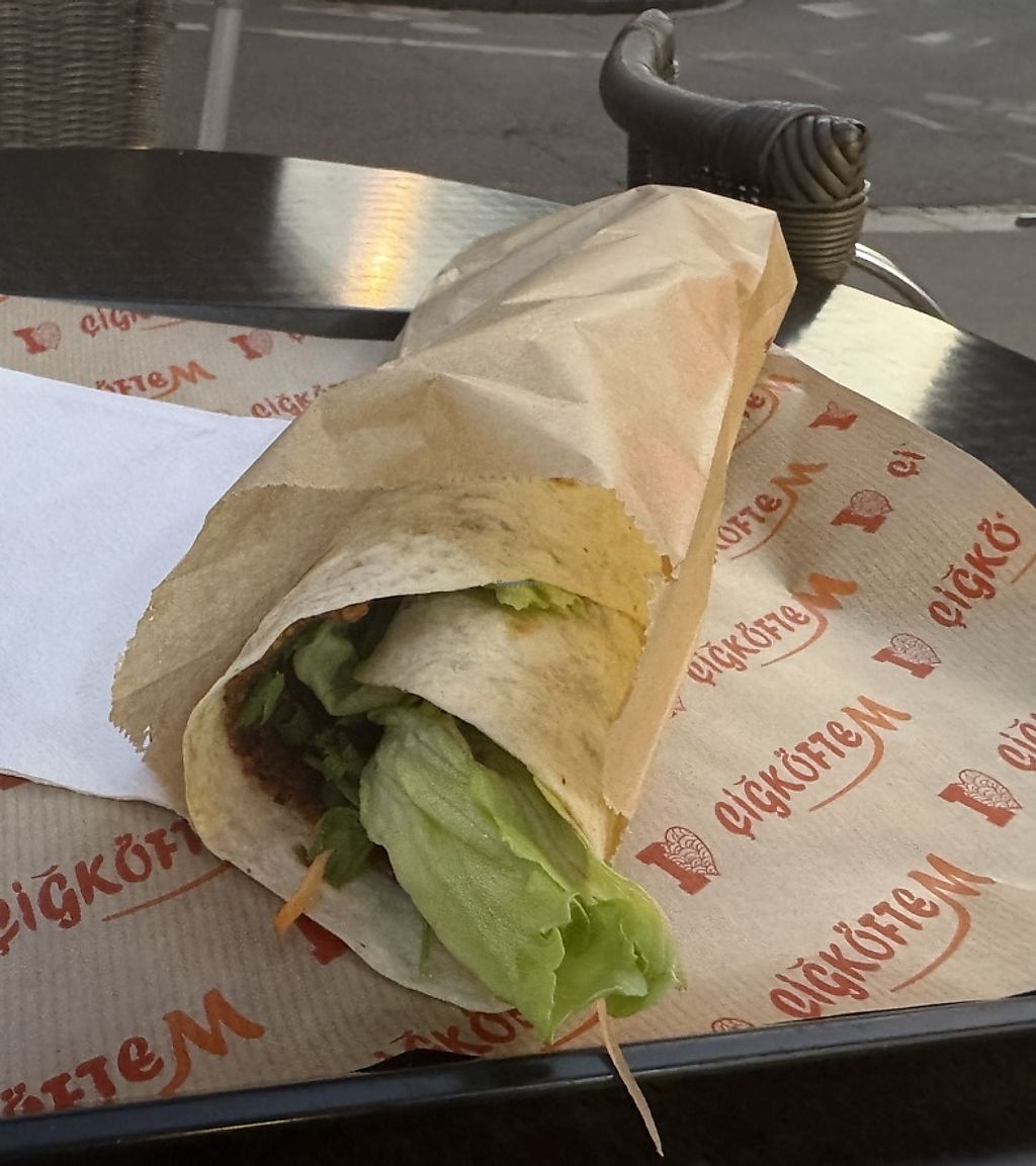 I tried the big cigkoftem wrap. It is a wrap covered with a past made from bulgur and tomato paste (and a lot of spices) and filled with veggies.