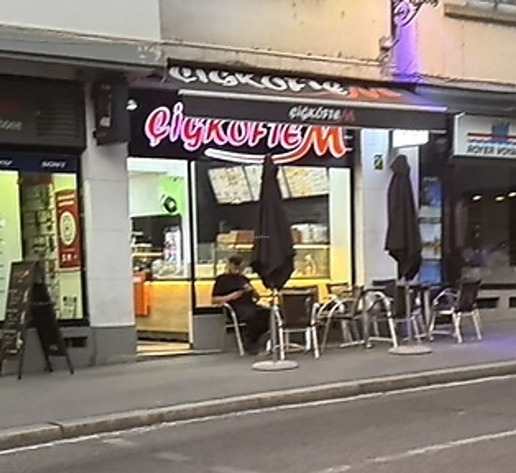 Service is fast and food taste the same at each franchise. Cheap: i got the big cigköftem for 6 euros. They have falafel as well. Two tables to sit outside.