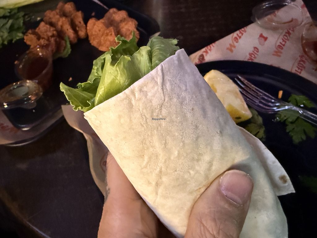 We got the vegan nugget wrap (the server told us they can't do this in the large wrap style) but the portion is quite generous regardless. Nice mix of veggies and makes a pretty simple but tasty meal.