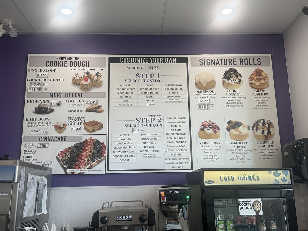 A huge variety of toppings for custom cinnamon buns plus cookies and brownies. They even do catering. The store is nice and bright and friendly staff.