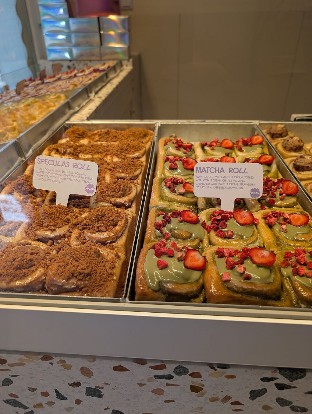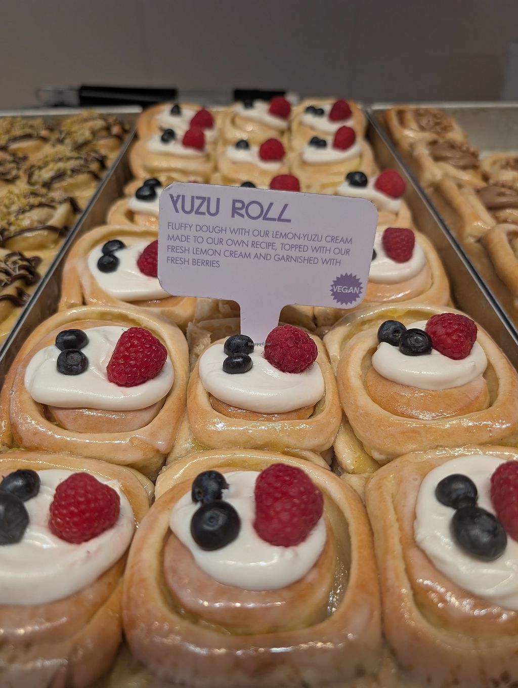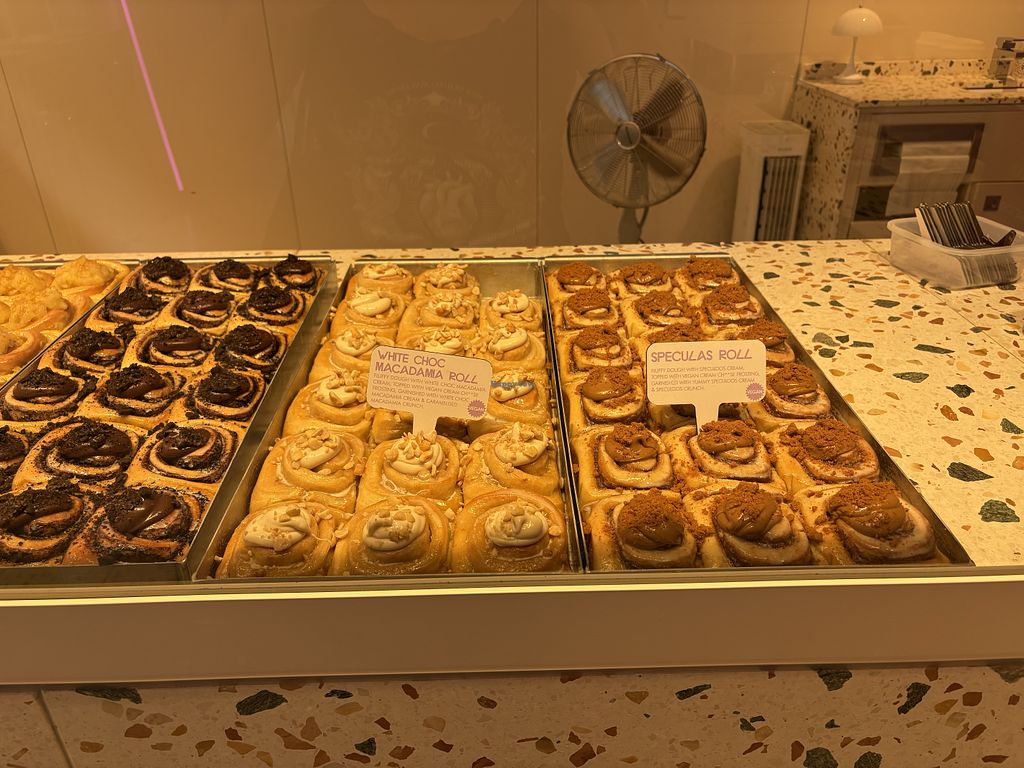Had the apple cinnamonroll, delicious. Very soft and tasty. Lots of apple. Apple flavour is vegan, quite a few others are as well