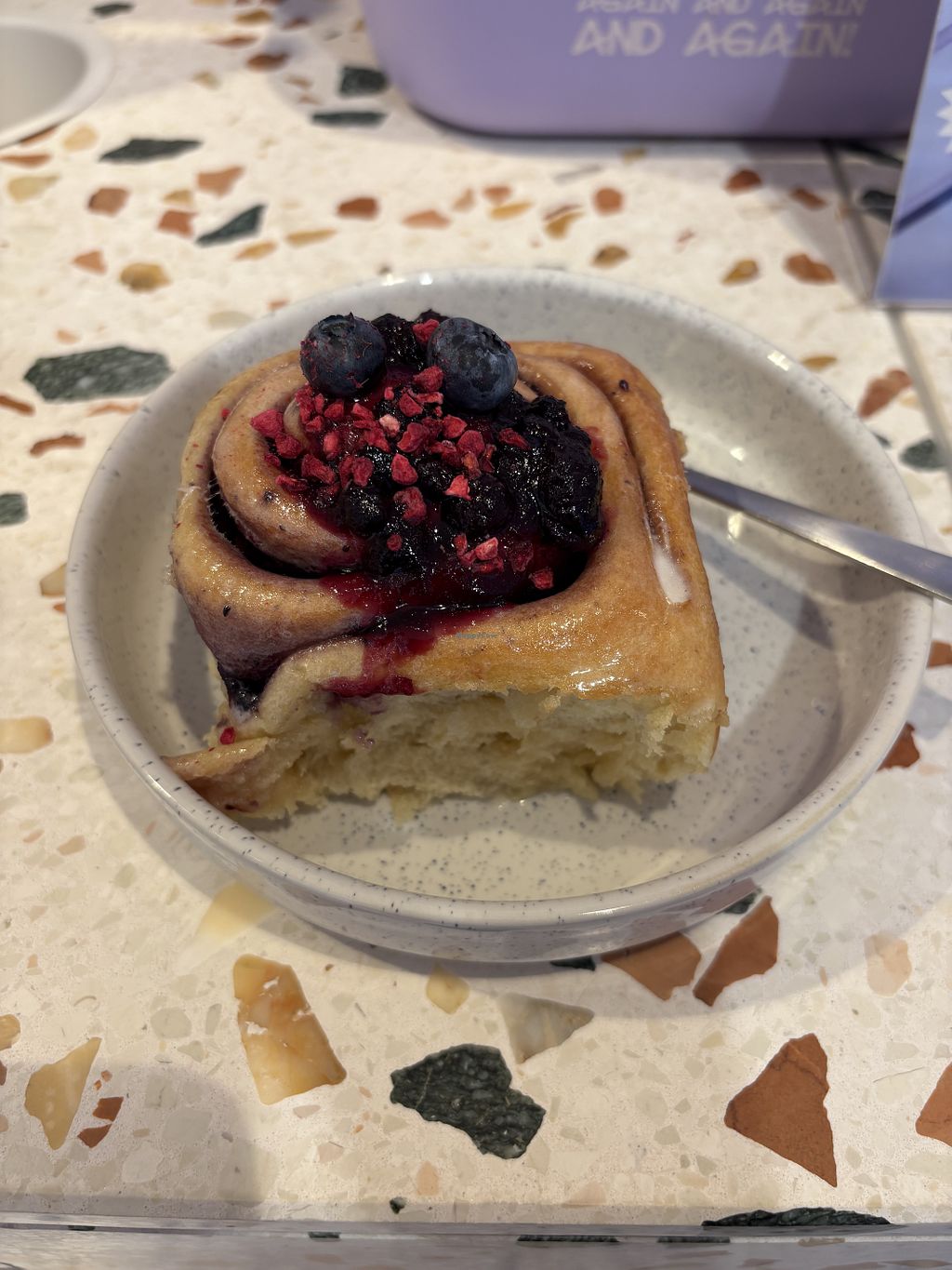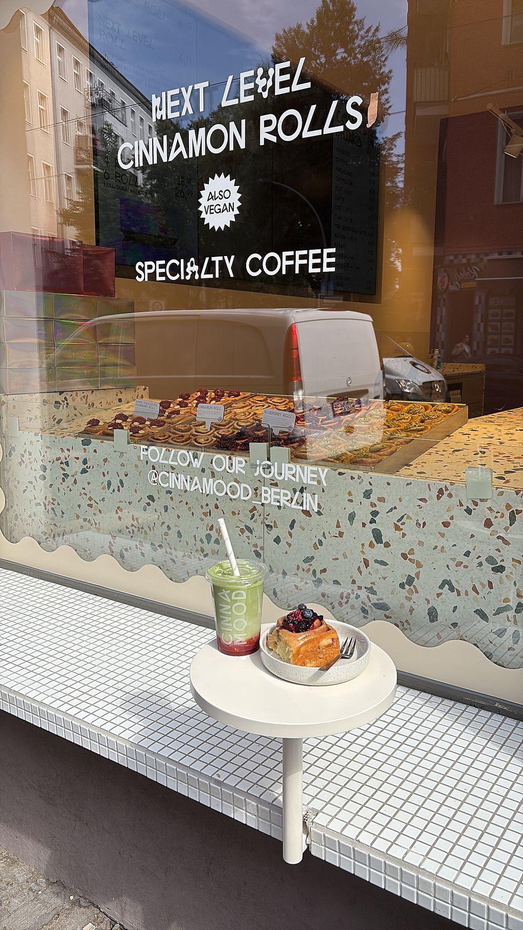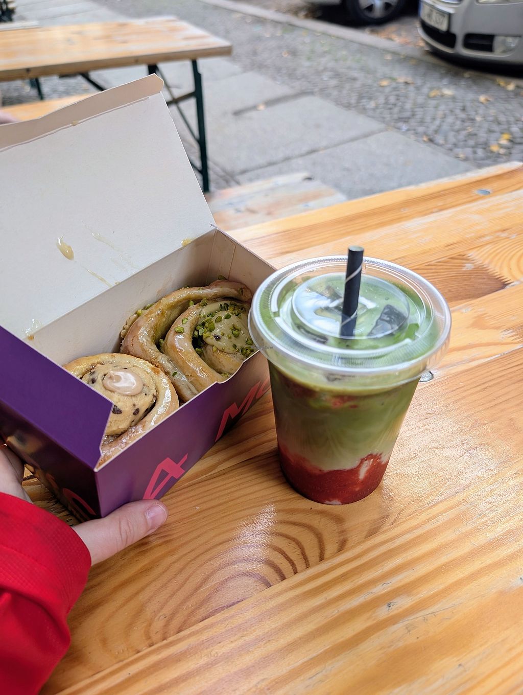 At least 2/3’s of the buns were vegan when I went in. It was so hard to decided but luckily the lovely lady helped me out! I went for the blueberry (considered less sweet) and it was incredible! Strawberry matcha with coconut milk to wash it all down
