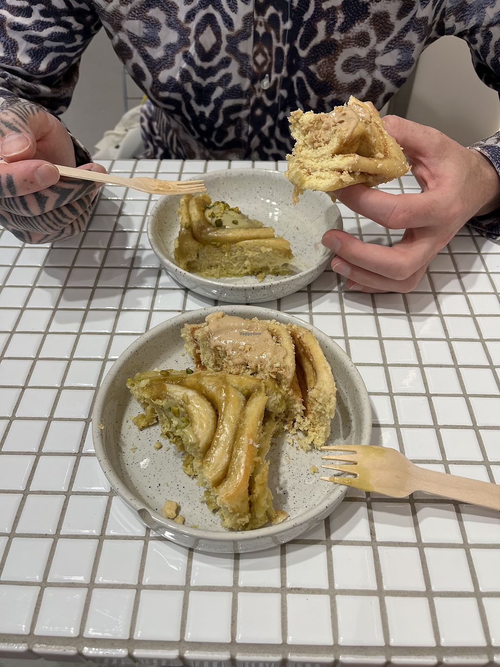 The cinnamon bun with pistachio was amazing! They have a large selection of vegan buns. Also has a good cappuccino with oat milk!