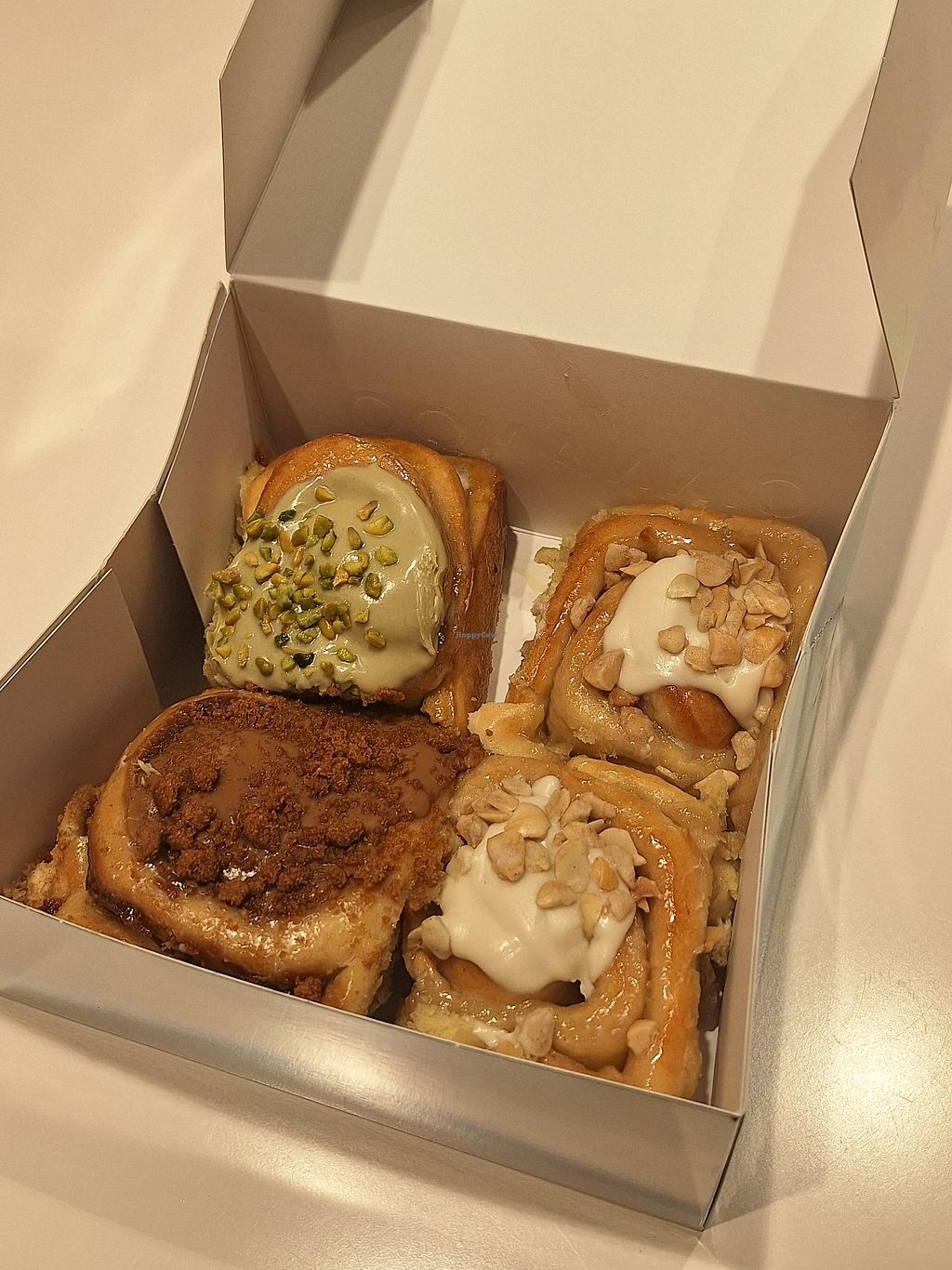 5 vegan options. I got the Carrot cake one. It was incredible. A little pricy but worth it considering vegan cinnamon buns are so hard to find!