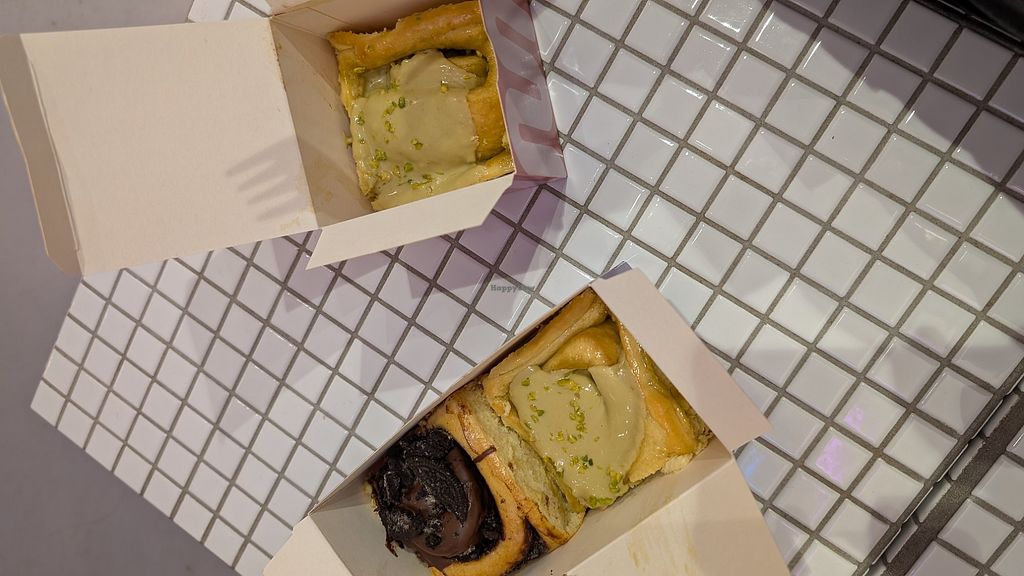 Cinnamood's buns are soft, tender rolls with creamy toppings. Quite a few of the buns are vegan, and the vegan options are clearly marked. I ate the pistacchio one, and I will admit it was pretty delicious.