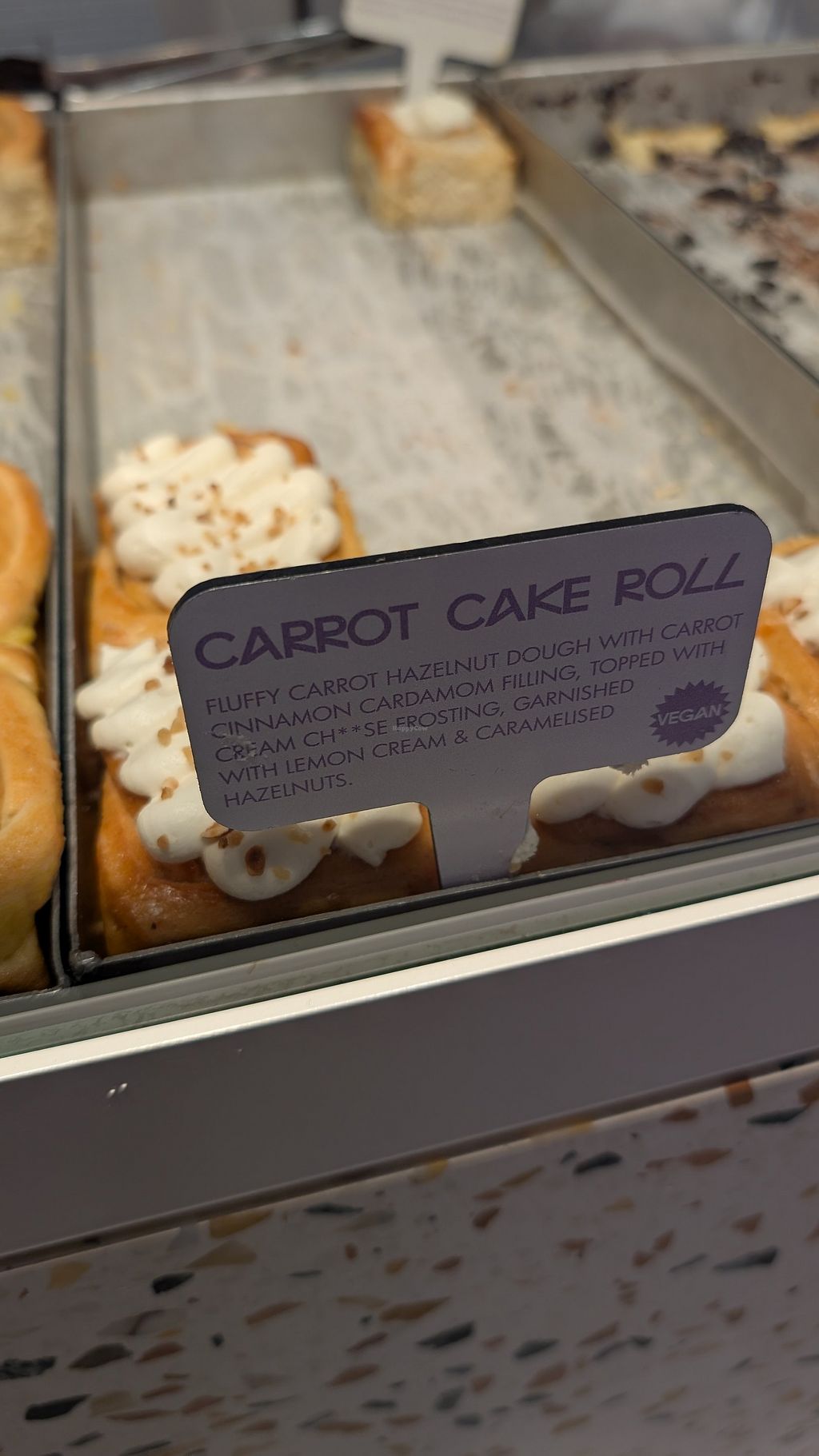 On the plus side, there are many vegan options on offer. Whether the cinnamon buns taste good is a matter of chance. On my first visit, they were perfect and tasted wonderful. The second time, they didn't taste as good and could have stayed in the oven longer. The prices are also steep, and you are not allowed to get two wooden forks, which is really incomprehensible given the price.