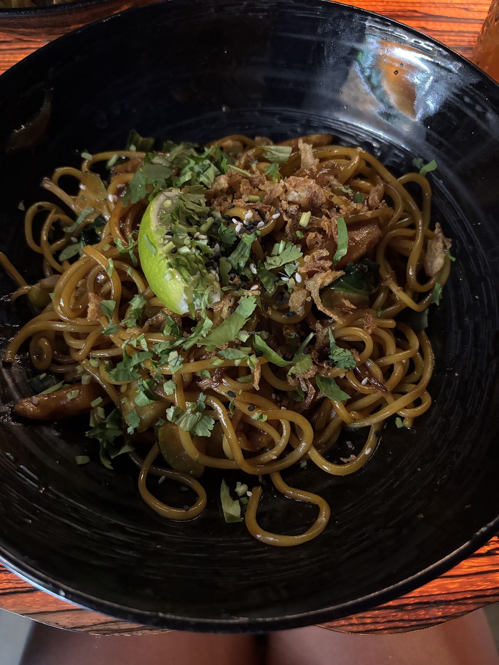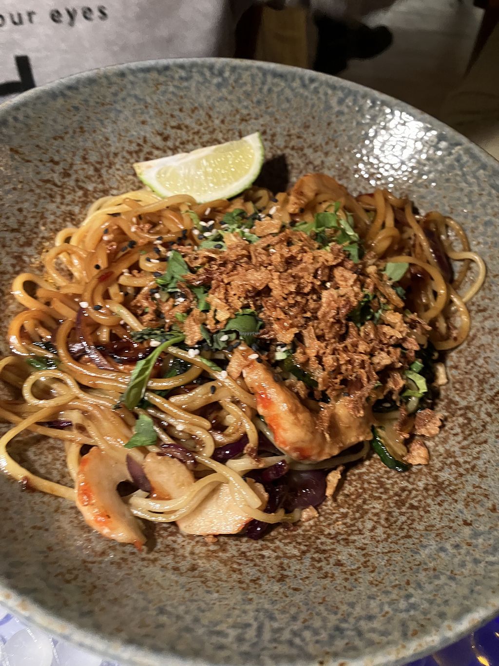 I had the soy sauce noodles, the vegan shrimp was good! The vegan snickers for dessert was a little sickly but did taste good, it comes with a fruity yoghurt which went great with it. Seems like it’s a good idea to book ahead as we had to share a table with another pair.