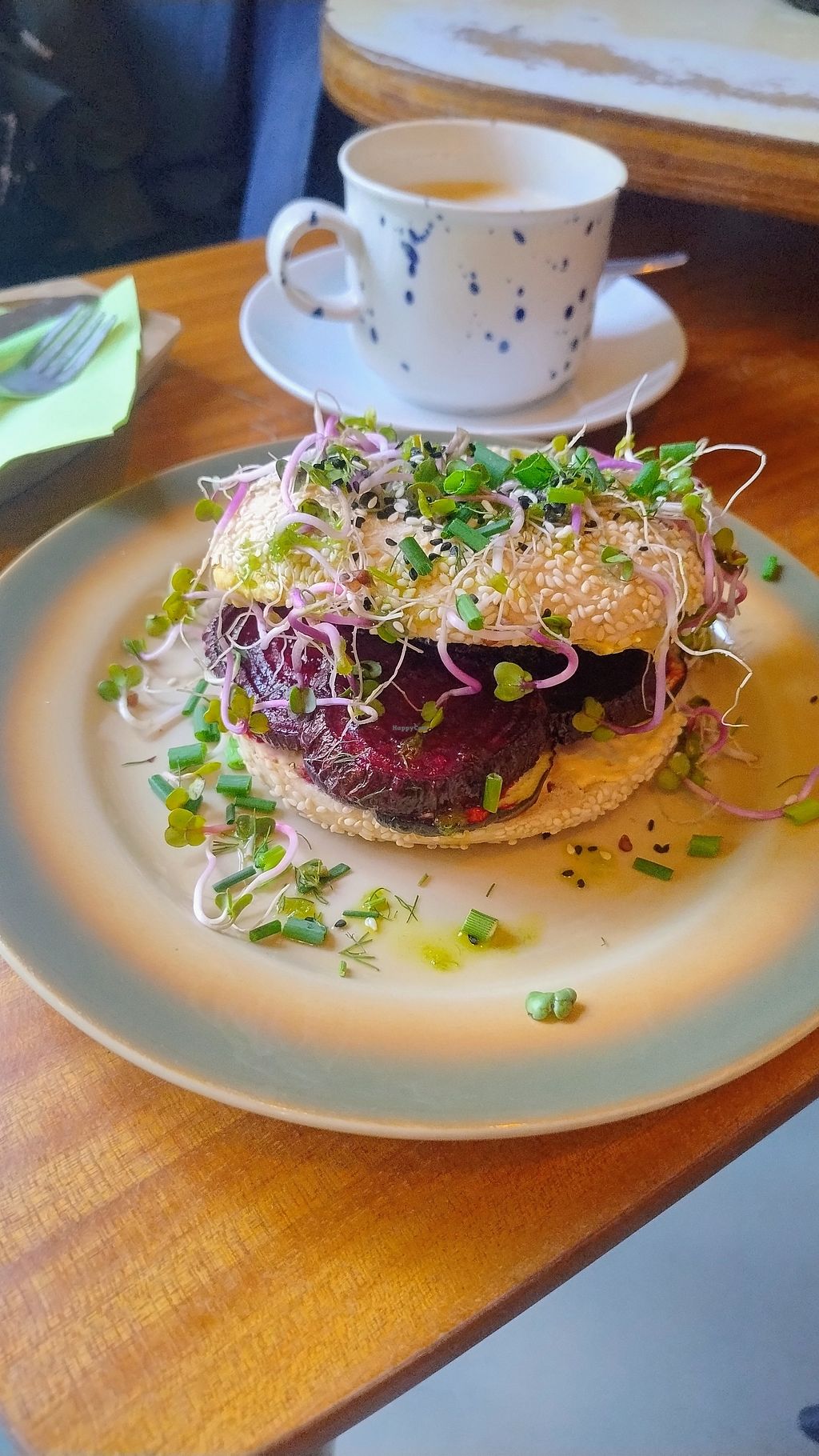 Pyszna kawa latte. Szkoda, że za mleko roślinne trzeba dopłacić - jakoś nie pasuje mi to do miejsca przyjaznego weganom. Większość opcji w menu zawiera jajka i różne sery, ale prawie wszystko da się zweganizować. Tym razem wzięłam bajgla z burakiem i hummusem. Był dobry, ale bez szału. Samo pieczywo trochę twarde. Jakiś czas temu jadłam burgera i był lepszy.