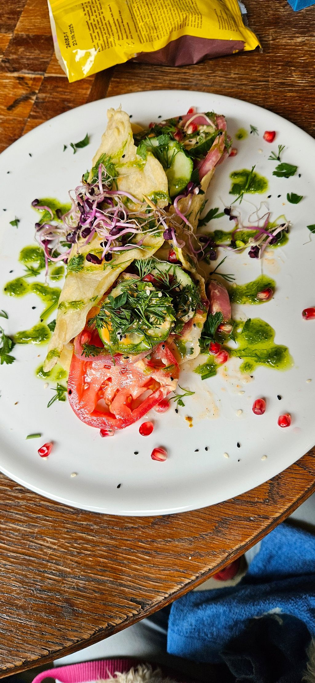 We stuck mostly to vegan eateries but decided to try this veg place and I’m glad we did. Most dishes had a proper vegan option. In other words it wasn’t a case of leaving things off, rather using tempeh, tofu etc rather than other things. A healthy menu. No fake meats as far as I recall. I had baked avocado which was a whole avocado filled with chunks of delicious tempeh and a large tasty side salad that includes a delicious dressing and some pickled items. He had a burger which was tempeh which I was very tempted to return to try myself but didn’t get a chance. We had drinks which were beautifully presented and ‘dressed’ with herbs/botanicals etc nice relaxing interior, quiet, helpful staff and I noticed a small garden out the back.