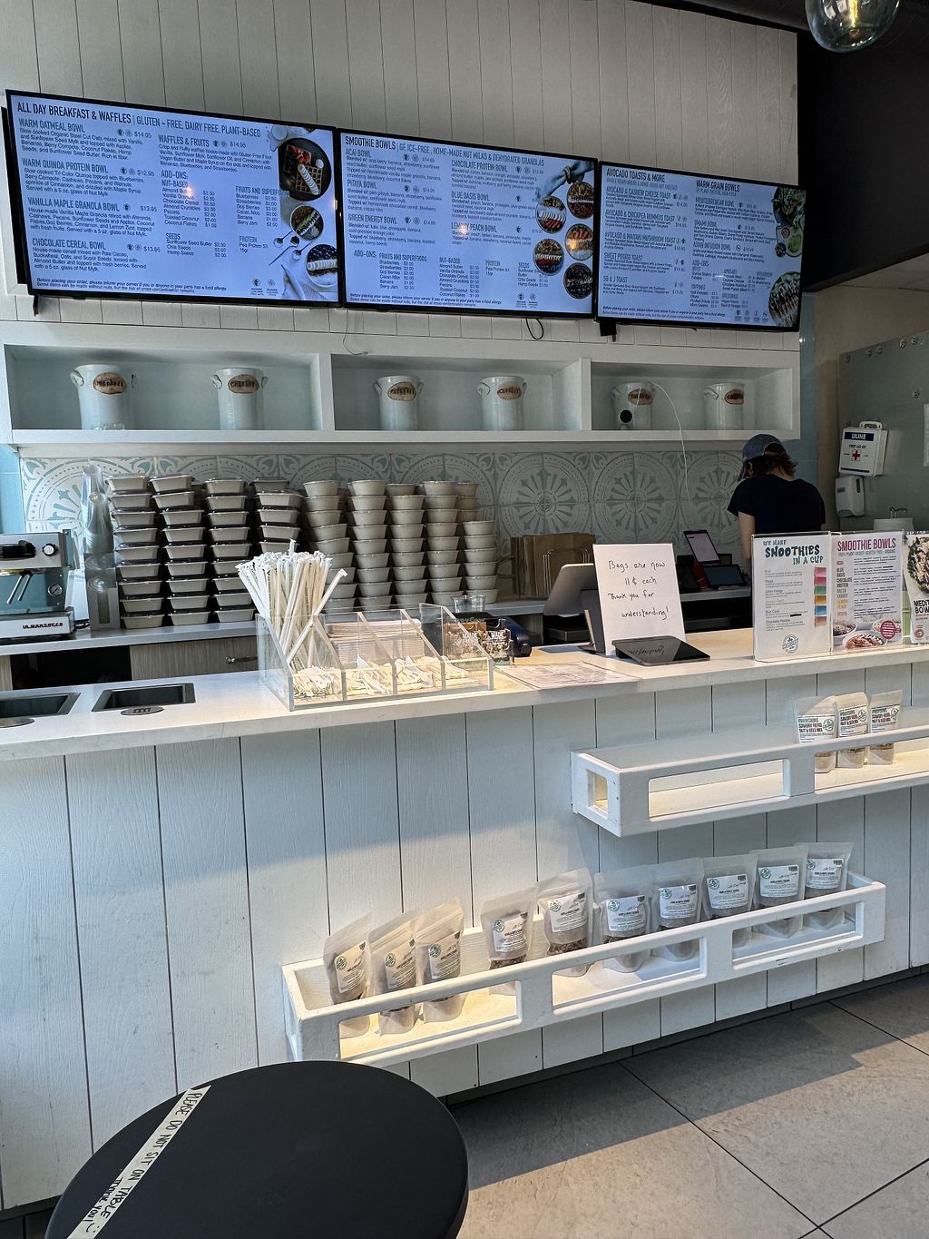 Clean place, take out only. Made to order smoothies and toasts.