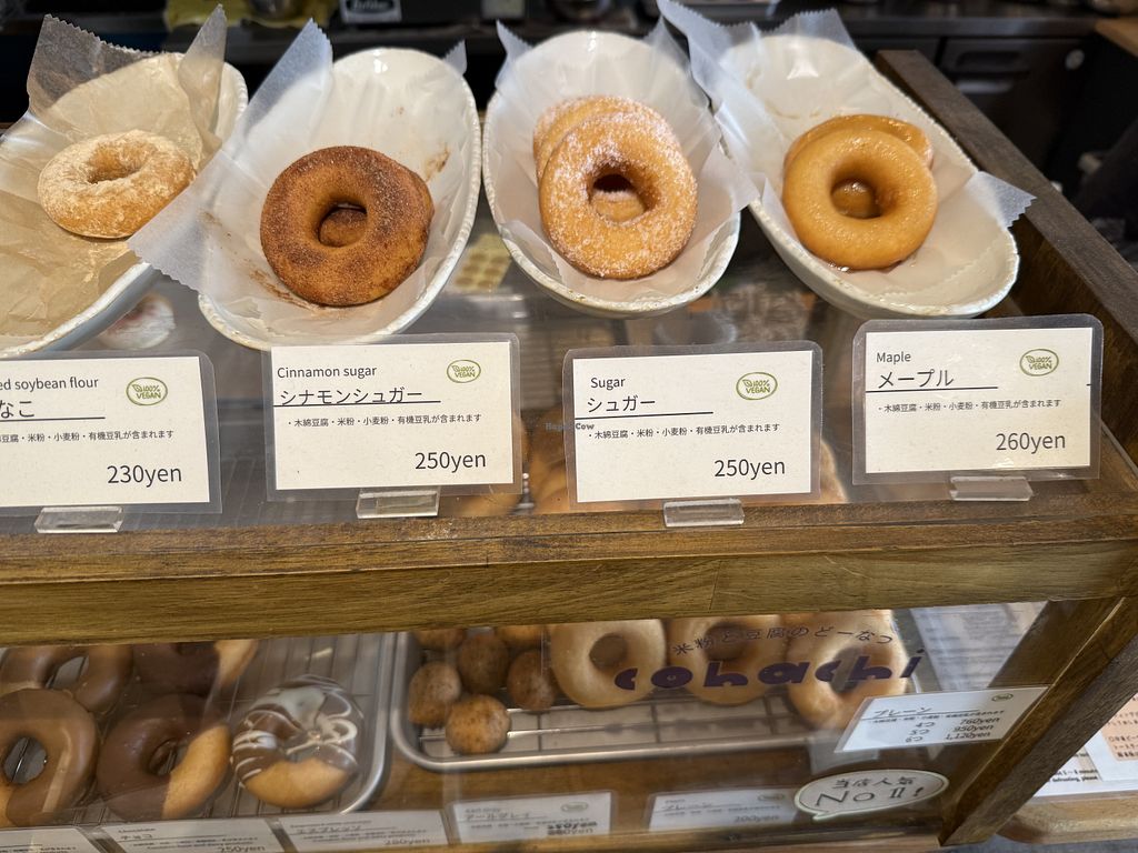 They have four vegan donuts, plain, sugar, kinako and maple.