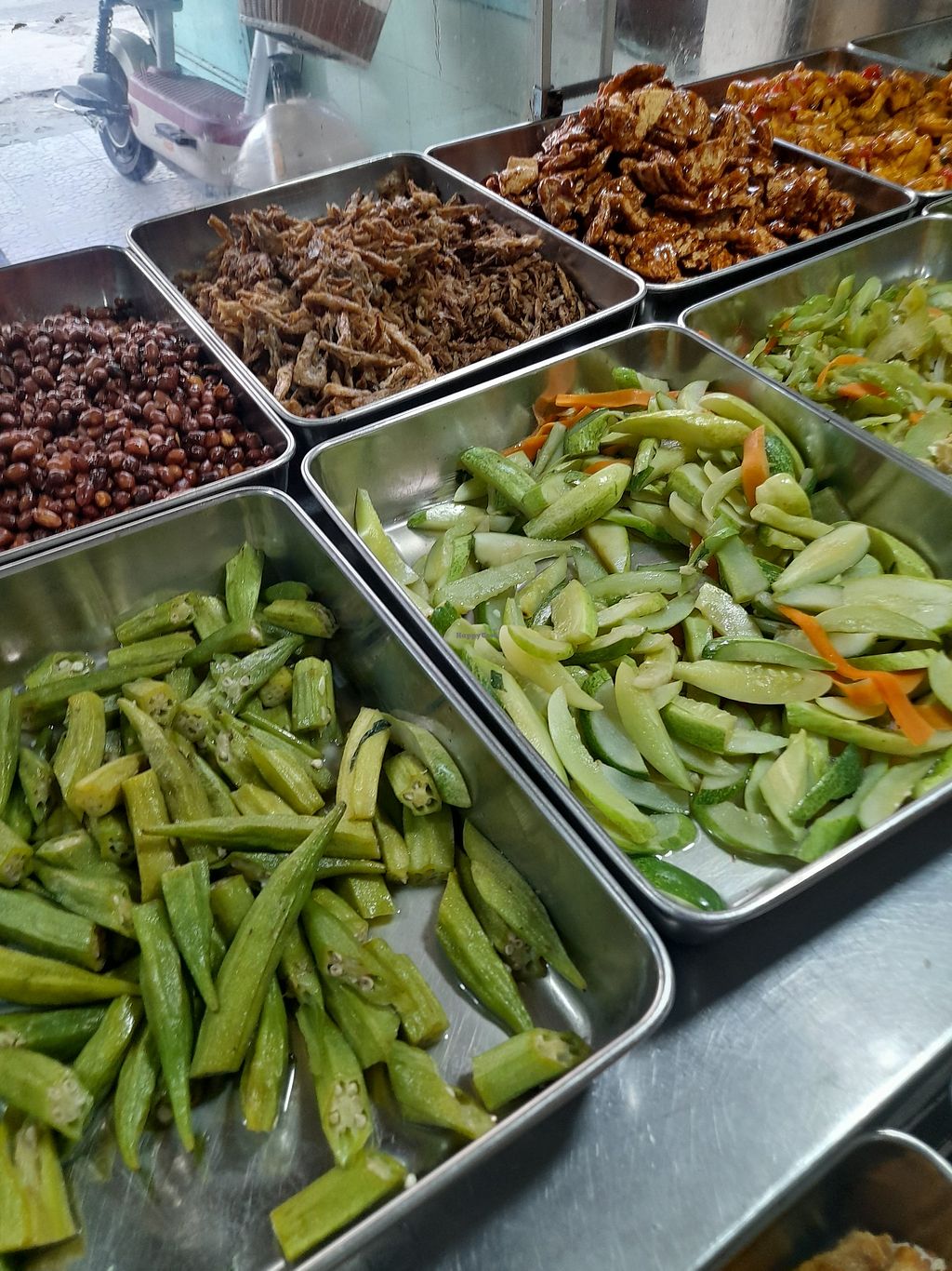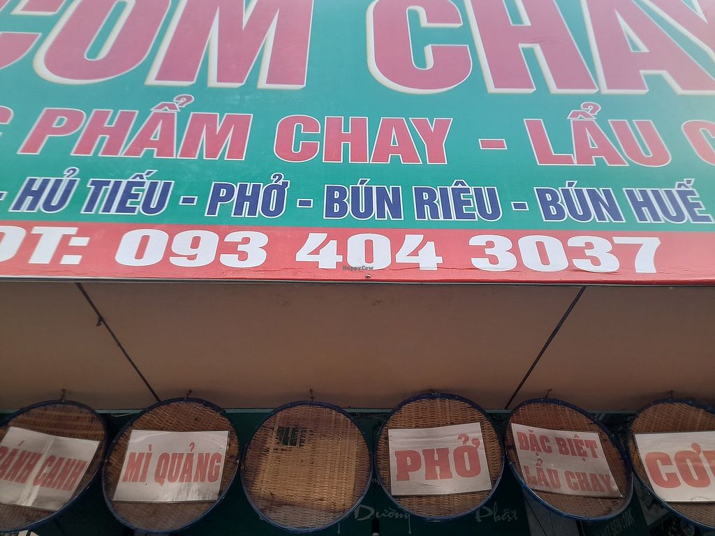 Massive selection of com chay (ultimate fast food in the world). I chose various items from veggies, tofu and fake meats. Altogether the cost was 20.000 Dong. Got a free soup with my vegan rice meal. Two young friendly ladies from the place. They can't speak English, but smiles all round. No menu in English too. Payment by cash or bank transfer. A few tables inside. They also have various vegan friendly drinks for sell including plant based milks.