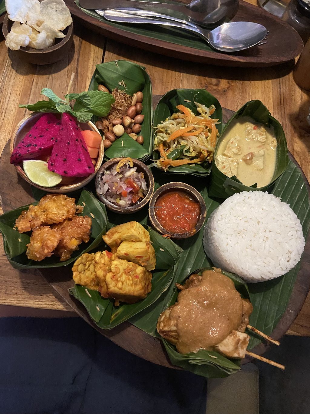 Read moreThe vegan Mix Rice (Nasi Campur) is a really yummy box full of little things like fritters, tofu-satay, veggie-curry, sprouts, tempe, peanuts with coconut flakes, spices, souce & white rice. Also a small bowl with fruits.. all the small bowls are made of banana leaves.