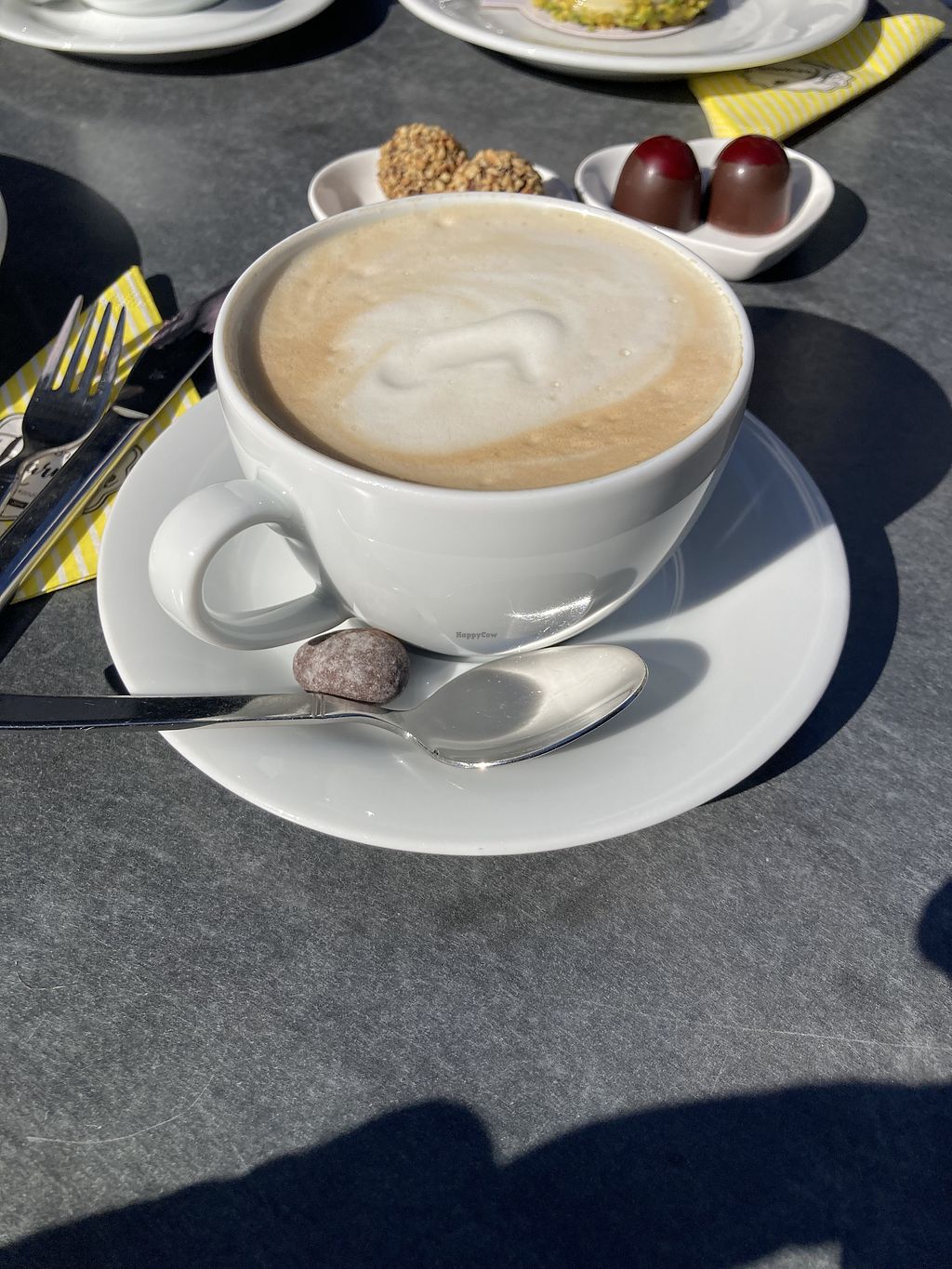 There are three small vegan tartlets and various pralines to choose from. They also serve excellent coffee with a selection of plant based milk. Everything tasted amazing!