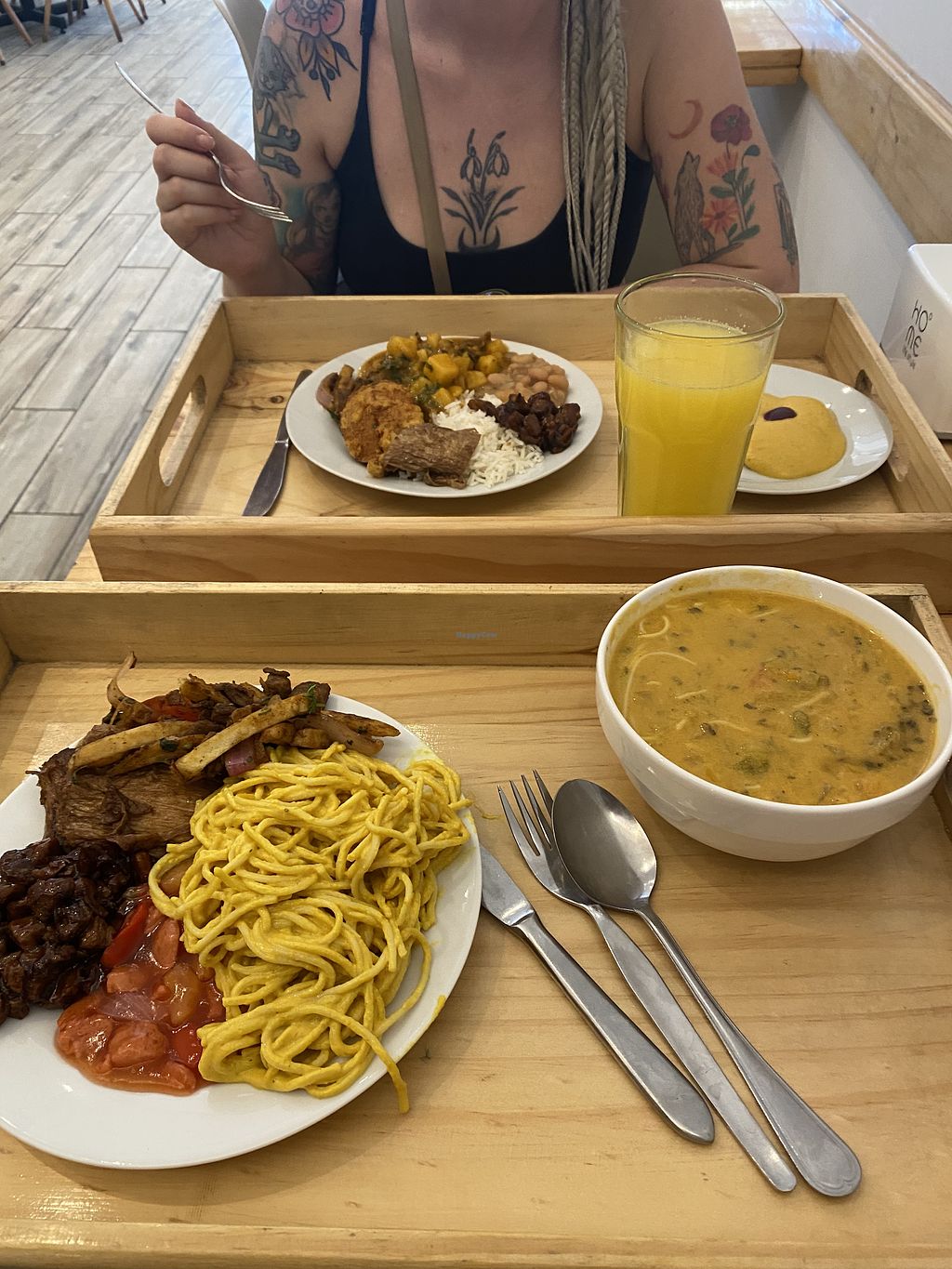 Peruvian food, all vegan, sooooo delicious. 17 sol, drinks included. Lovely staff as well. Definitely worth a visit.
