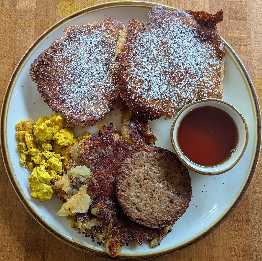 They were cleaning up and servicing the stove in the kitchen. Despite this, they were welcoming and friendly. I had the full breakfast with pancakes, hash browns, "sausage," and tofu scramble. The food was good. It tasted and had a mouth-feel like a non-vegan meal, which would be a plus for if you bring any non-vegans with you. The coffee was very good. The portion was huge and I left very full.