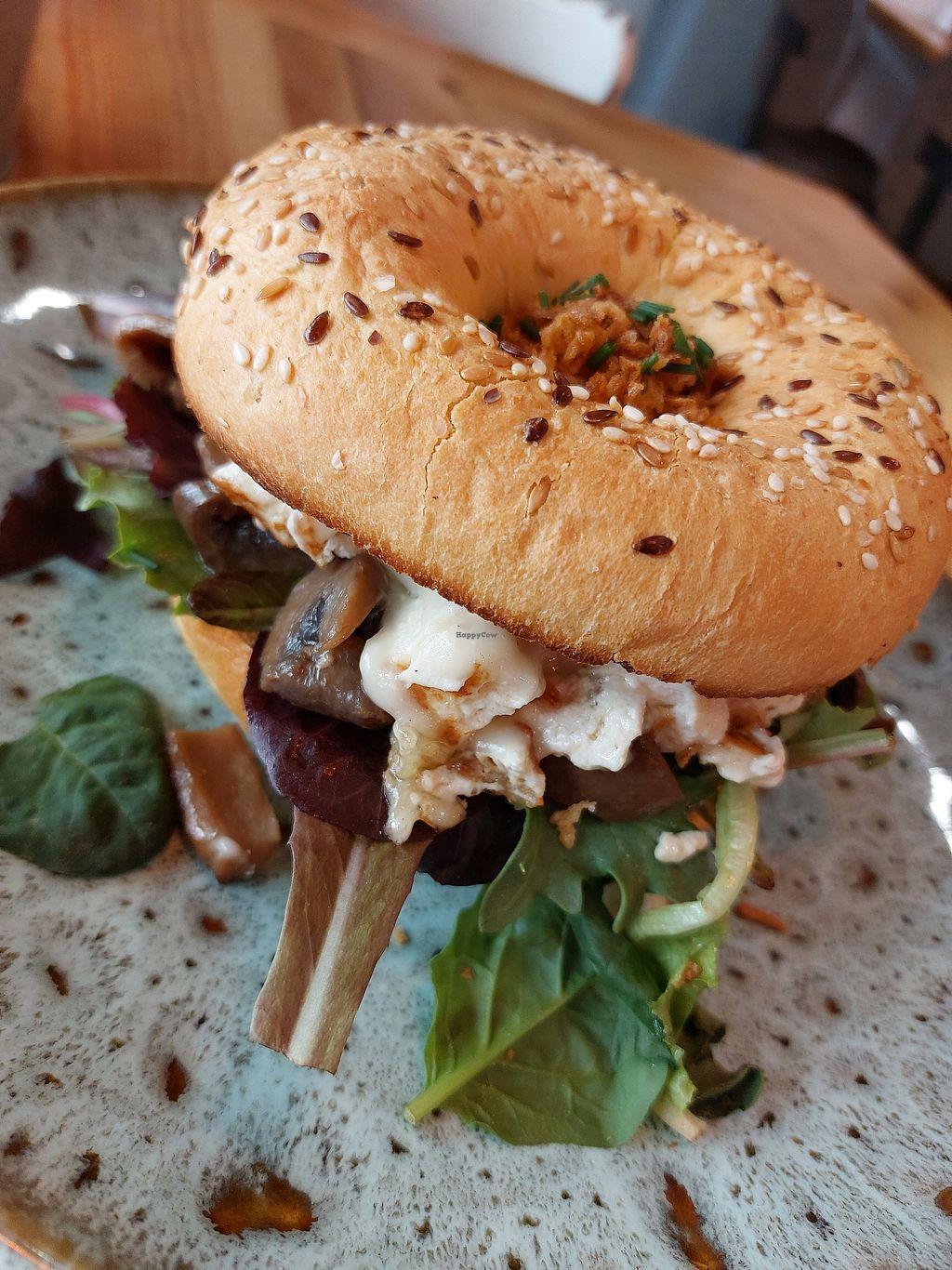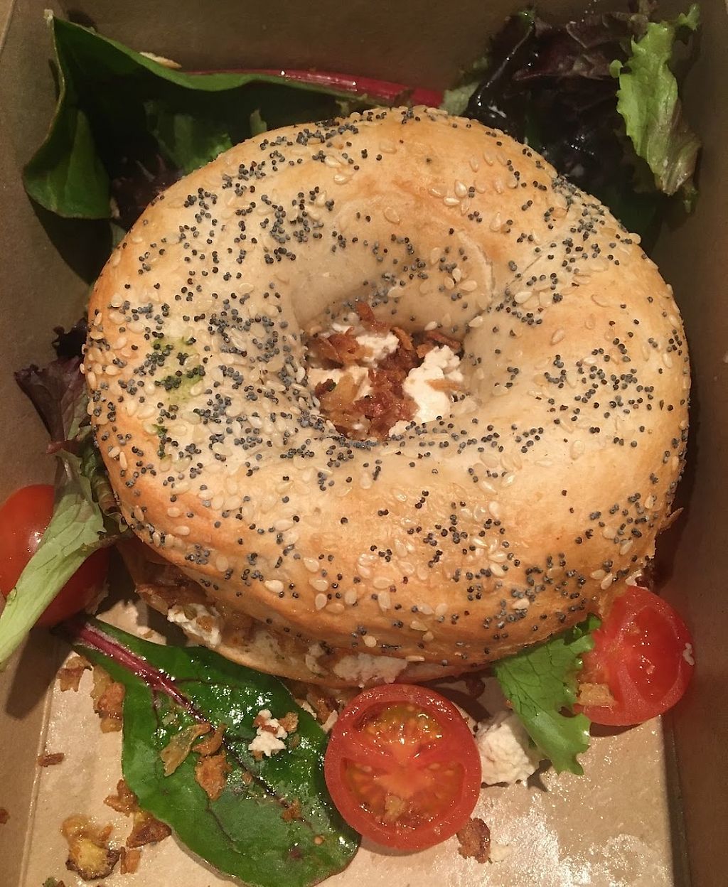 Not many reviews yet but worth the try. I had the vegana bagel with Crispy onion, chives, mushrooms, hummus, vegan scrambled egg, lettuce and beetroot sprouts.