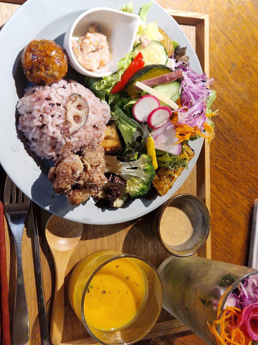 Cozy place with the best vegan food we've had on our vacation. They have three menu options - a Buddha bowl, a plate with the same ingredients as the Buddha bowl, and a curry plate. All three include soy meat, the portion sizes are big enough for Americans, and the presentation is gorgeous.