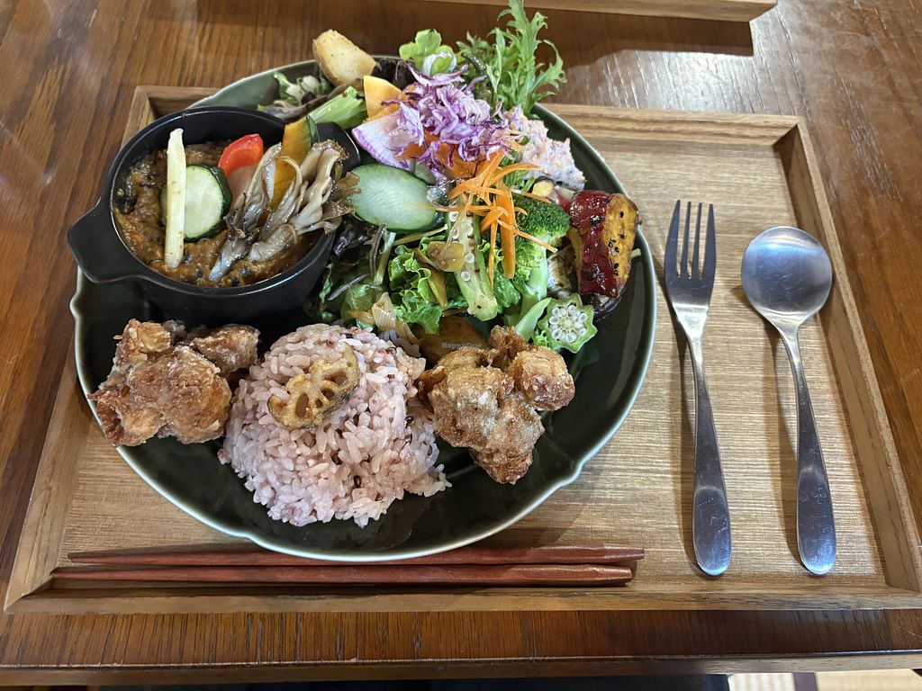 A beautiful 100 year old building down a quiet side alley in the otherwise bustling town of Hase. Shoes off, as it's all Tatami mats and low tables. Two main menu items, a curry meal and a buddha bowl. We ordered both, and they were divine. Very tasty and nourishing. We went at 3.30pm on a Friday. Only us and 2 other customers at this time. English spoken. Very lovely lady served us. Explained the food and a bit of the buildings history.