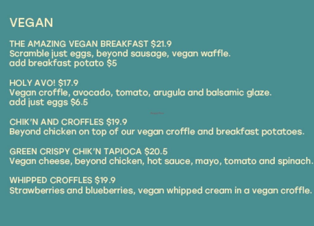 I had such a hard time deciding what to order as there were so many interesting choices and I still don't know exactly what a croffle is. After much debate I opted for the Green Crispy Chick'n Tapioca, this was so tasty. I don't know why more food isn't folded into tapioca as this is outstanding. It did seem highly priced, but it was so rich and filling, I could only eat half of it. I've been dreaming about this ever since. My partner liked his food too, but I don't remember what it was.