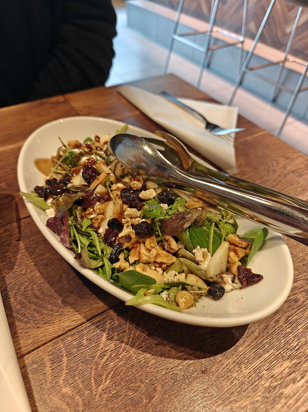 מקום ממש חמוד. יש להם דיל צוהריים, אכלתי המבורגר טבעוני שעשוי מטופו עם צ׳יפס ושתייה, ובנוסף הזמנו סלט עשבים ואבוקדו.