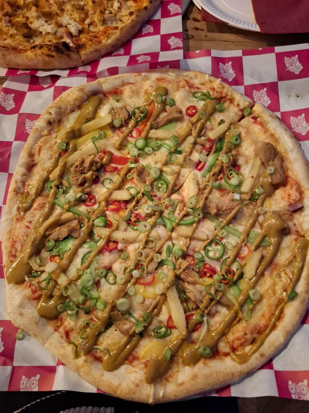 I had the S P pizza with salt and pepper ‘chicken’, chips, spring onion, chilli’s, peppers and curry sauce. Very tasty but a little overpriced in my opinion. A great option if you’re bored of the usual mixed vegetable pizza. The tables felt a little sticky/gross.