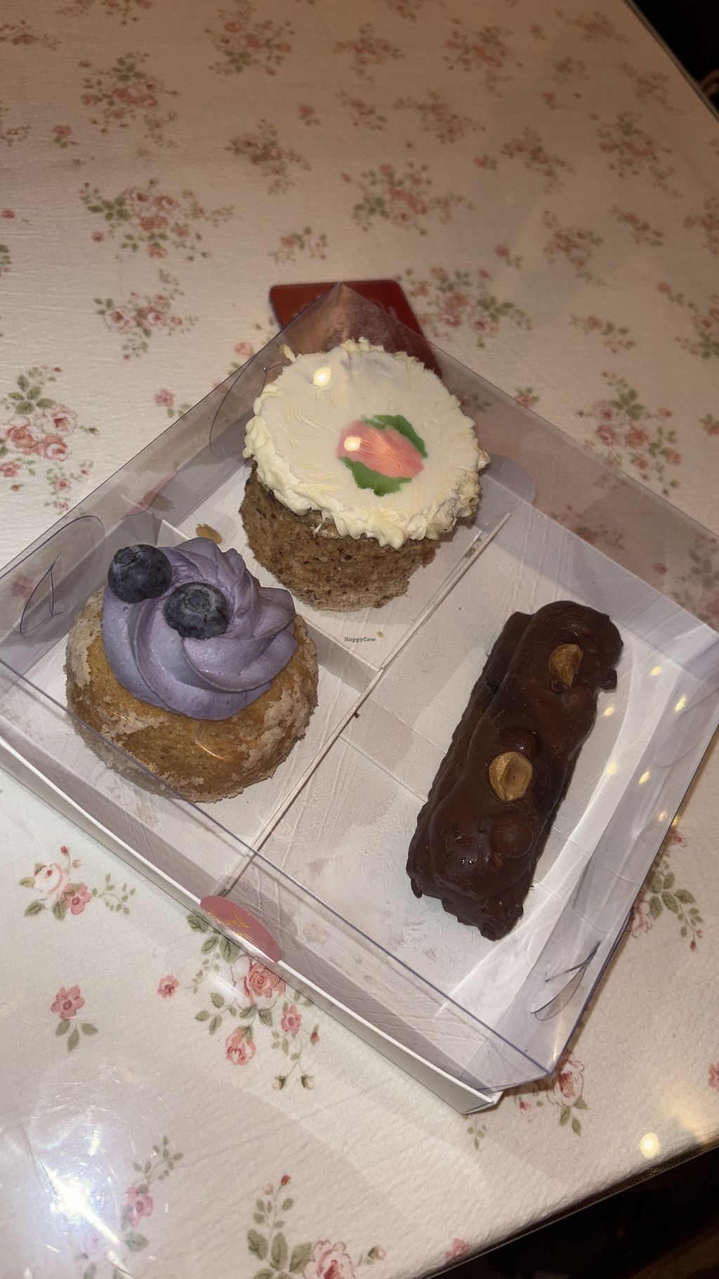 I loved everything about this cafe! The cakes were true works of art, couldn't believe they were vegan. I had the mini Rudolf - rich swiss dark chocolate and hazelnut cake - and my friend the pear cake. We enjoyed both of pur deserts. I had a great blue matcha and a croissant to go which was delicious. Will come back next time I am in London!