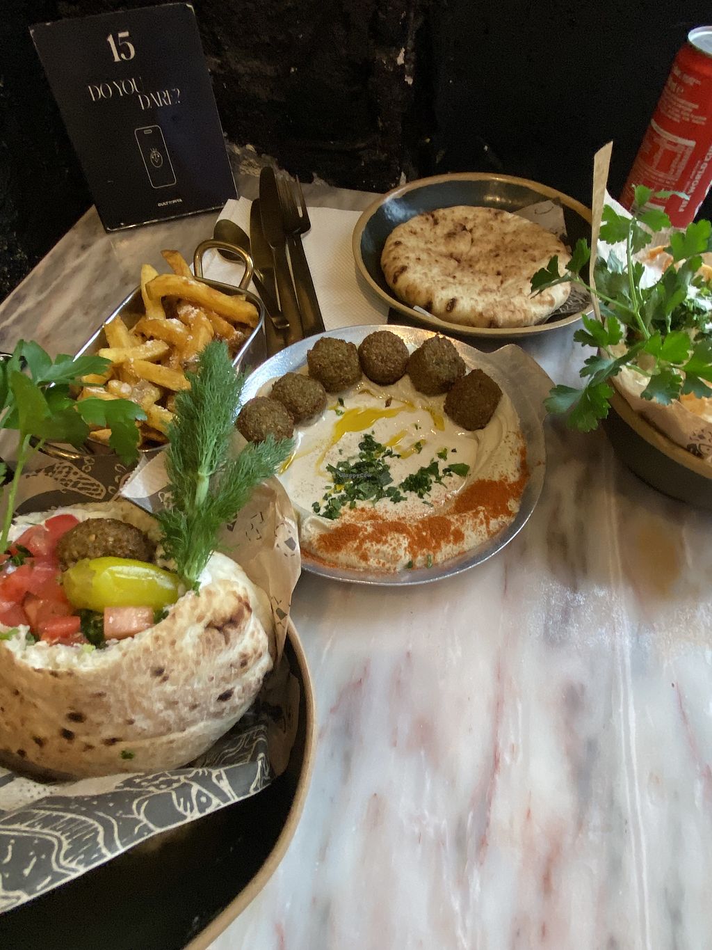 I ate the cauliflower plate but it was really underwhelming. Mushy and lacking flavour and salt. I left most of it. The pita was okay, but for a place that specialises in it wasn't nothing special. The thing we liked best was the vibe, great music, great concept and decoration. The staff was very very nice and offered us to try the falafel, some fried pita bread and even the salad! We were stuffed!