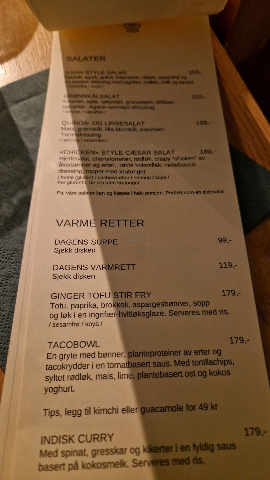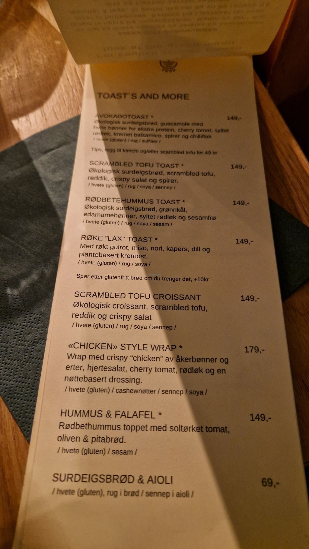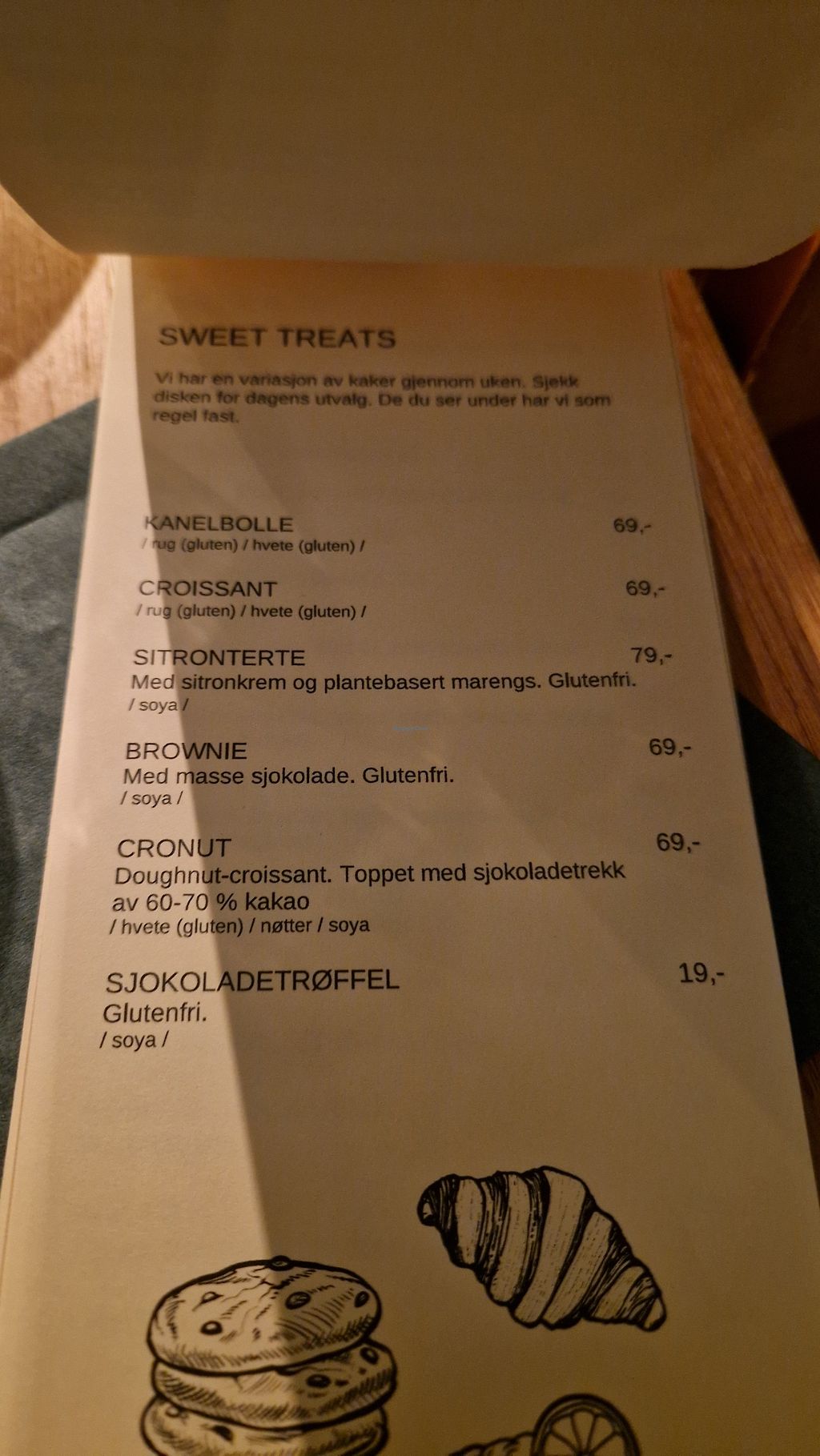 Read morethey have a set menu but also a dish of the day which is only 119nok(~10€). there's also have an amazing range of baked goods. unfortunately, they are rather expensive, the plain croissant i had was almost 6€🥲. at least the water is free