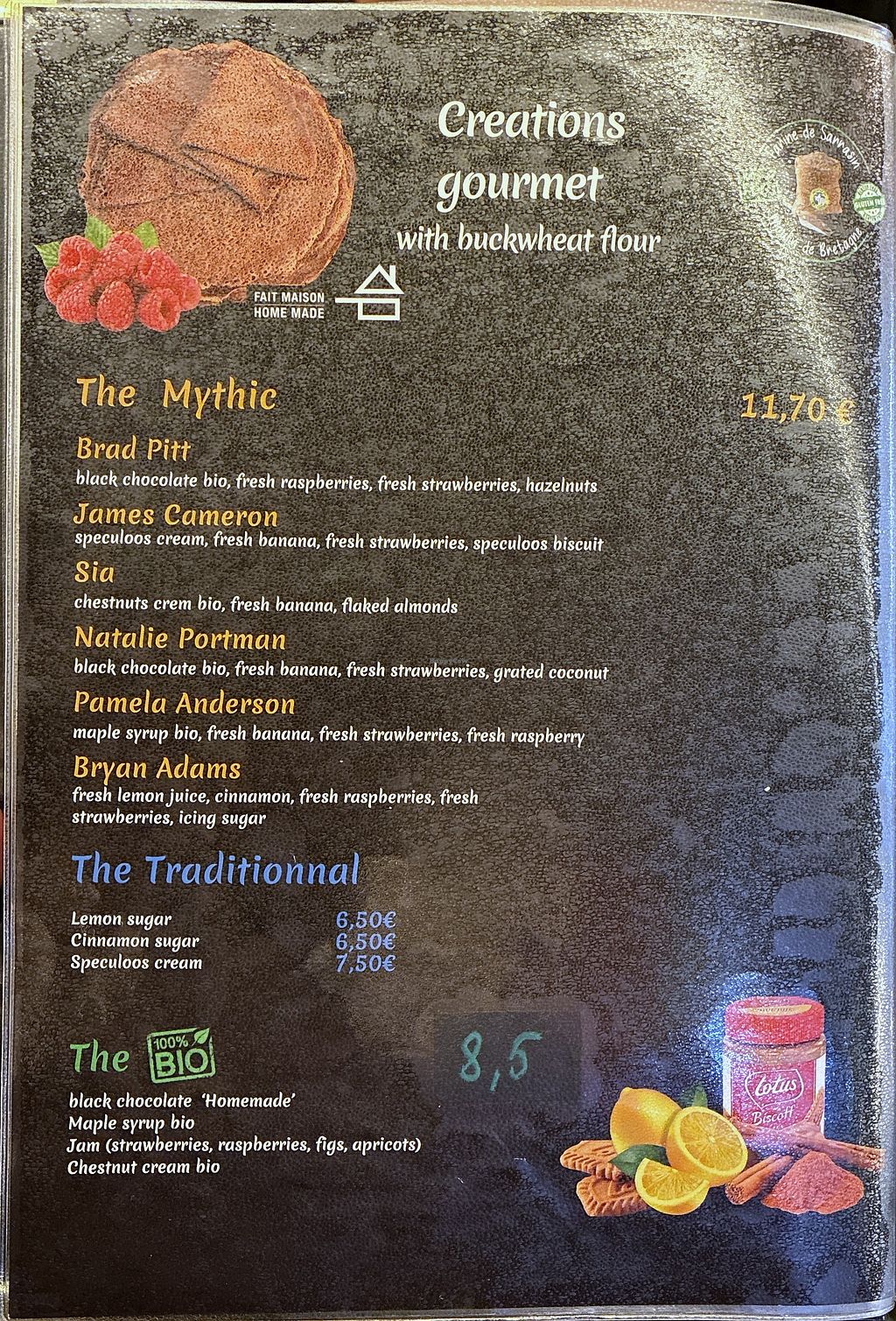Lovely buckwheat crepes. We had the “Brad Pitt” (homemade chocolate, strawberries, raspberries and hazelnuts) and the “James Cameron” (with banana and biscotti and strawberries). Drinks came with choice of almond or soya milk.