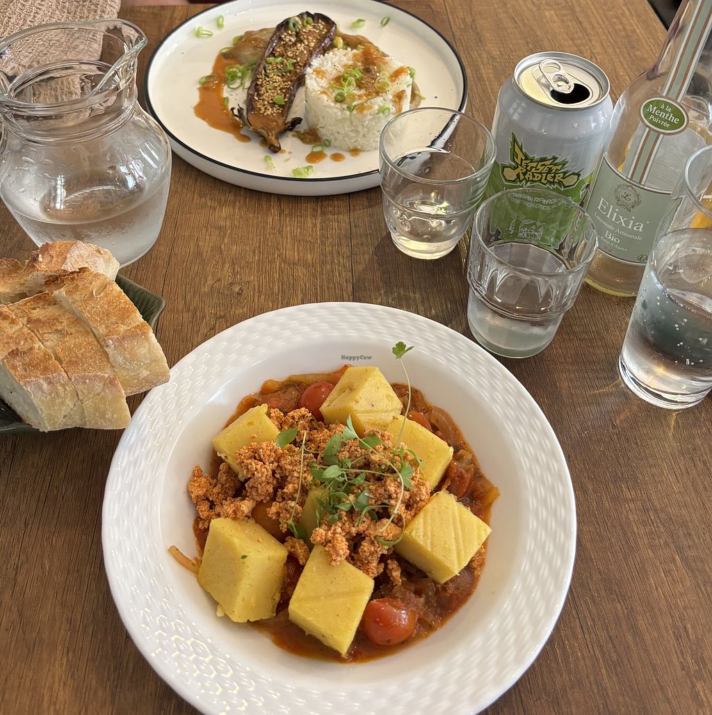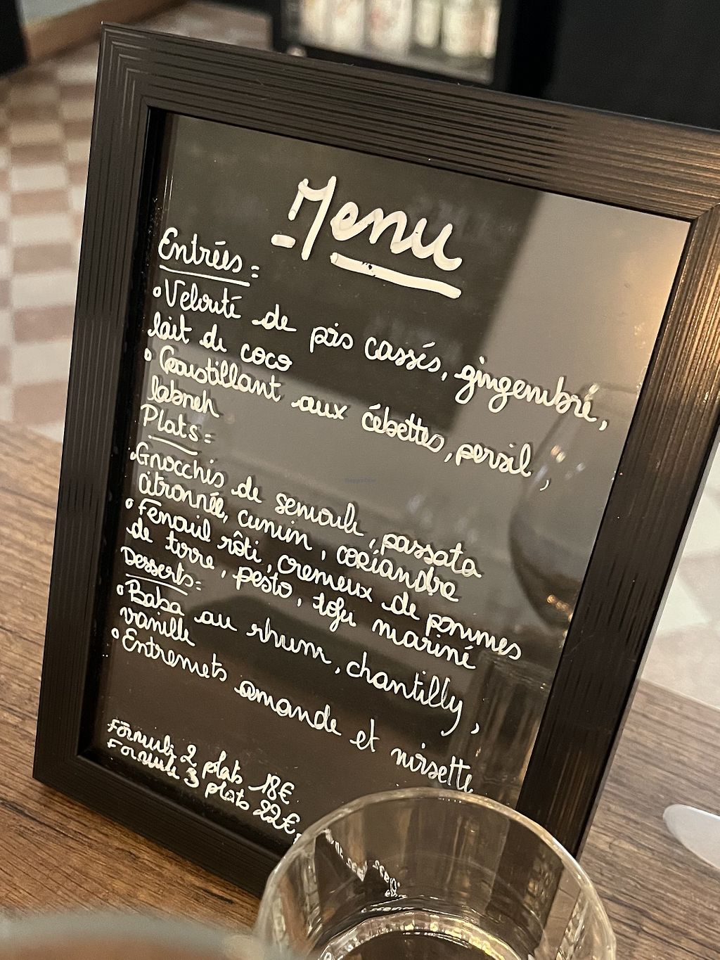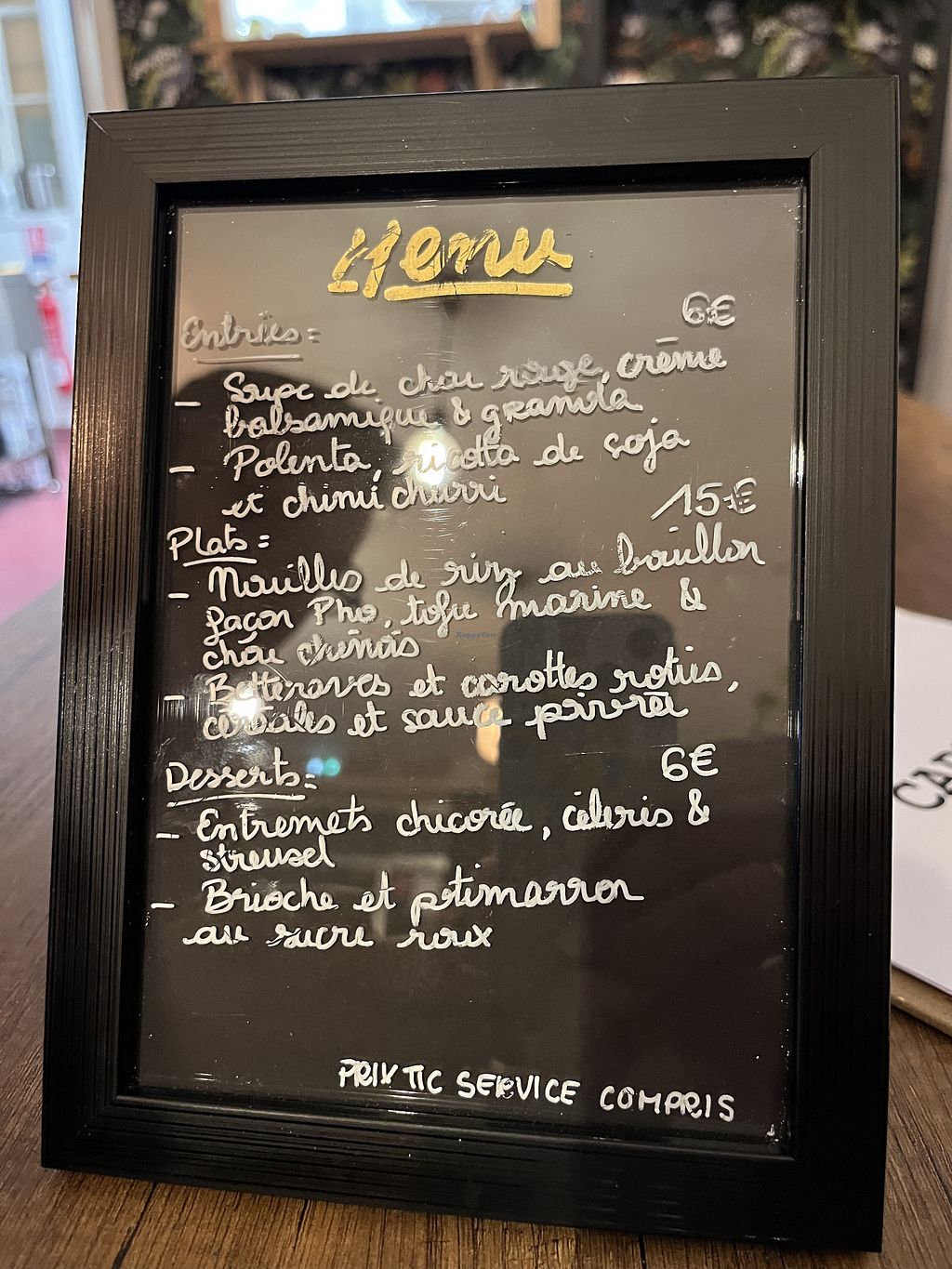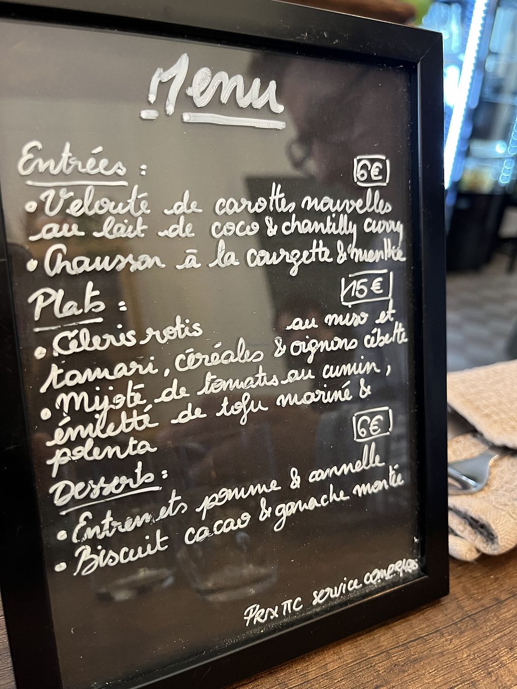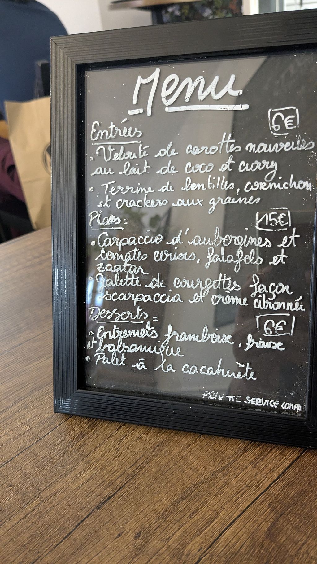 Do not skip this adorable place if you're in Dijon! Cozy atmosphere and a great team of ladies preparing great food. When we visited (end of August 2025) all of the dishes were vegan, the only non vegan thing was dairy milk in coffee if you wanted (oat and almond were the other choices). We had lentil pâté with seed cracker as a starter, raw courgette with scarpaccia and cashew cheese and an aubergine dish with falafel. All was plated with great care and looked as beautiful as it was tasty, filling but light.