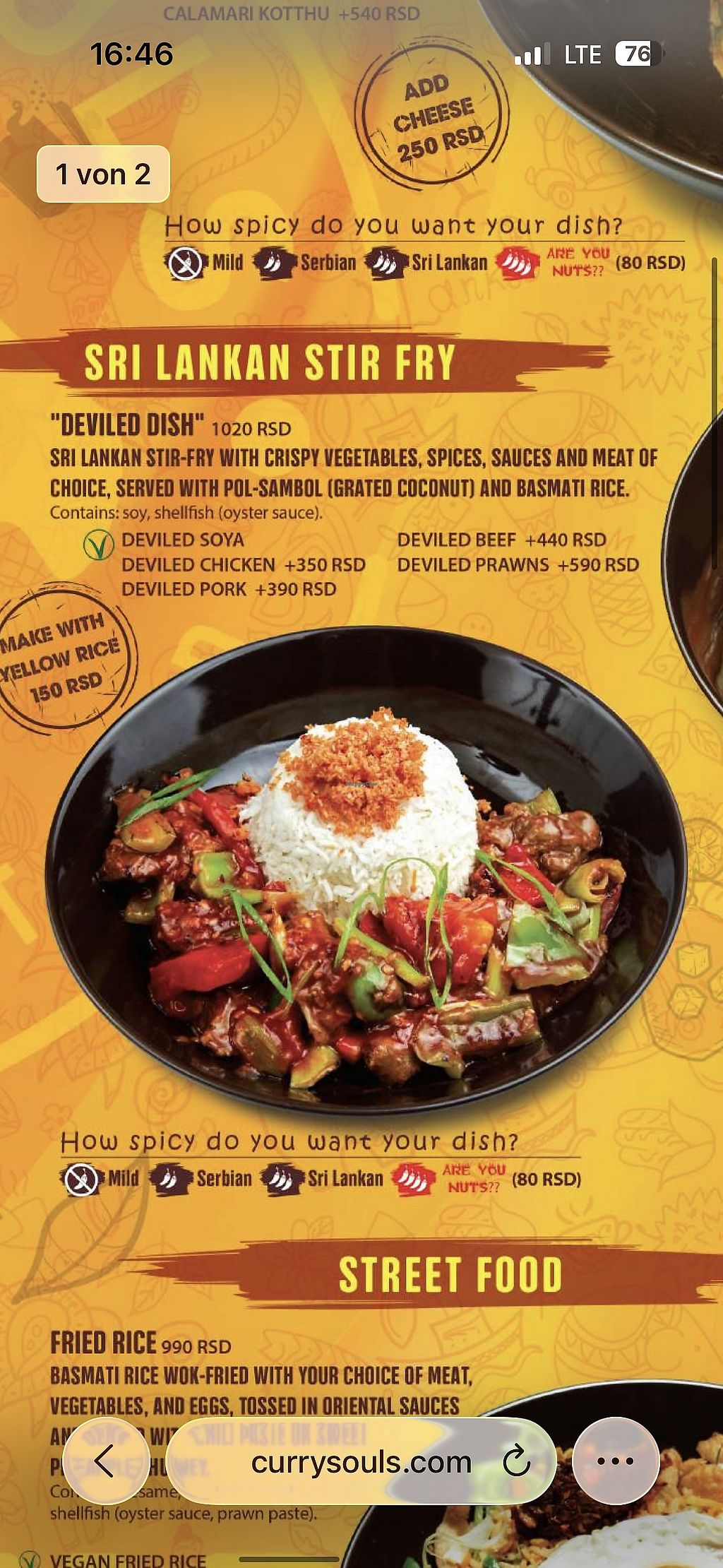 Ich hatte das deviled dish mit soja, das war unglaublich lecker und angenehm scharf in der Stufe Sri Lanka.